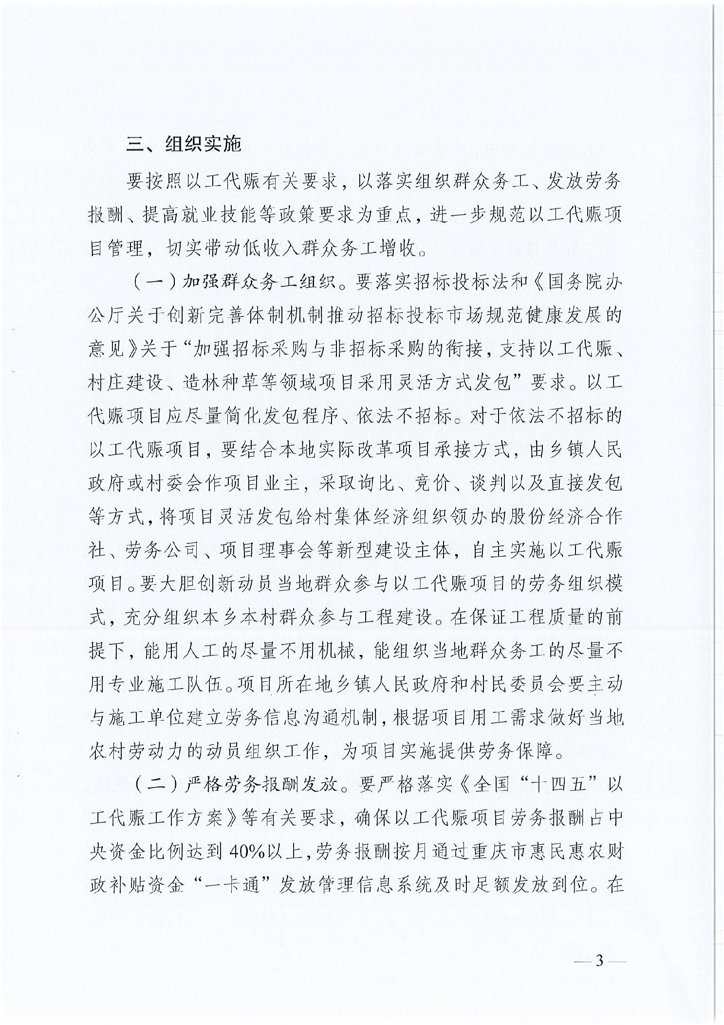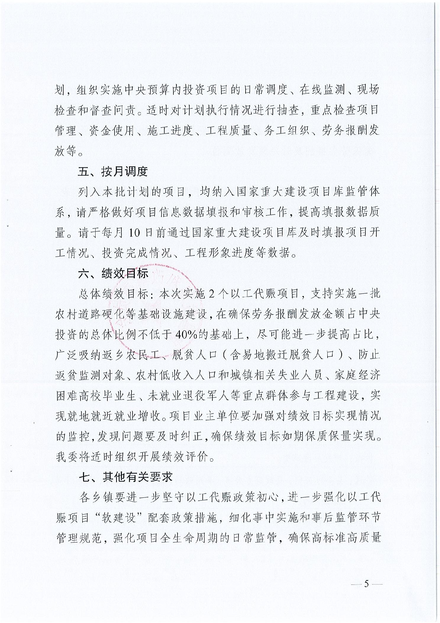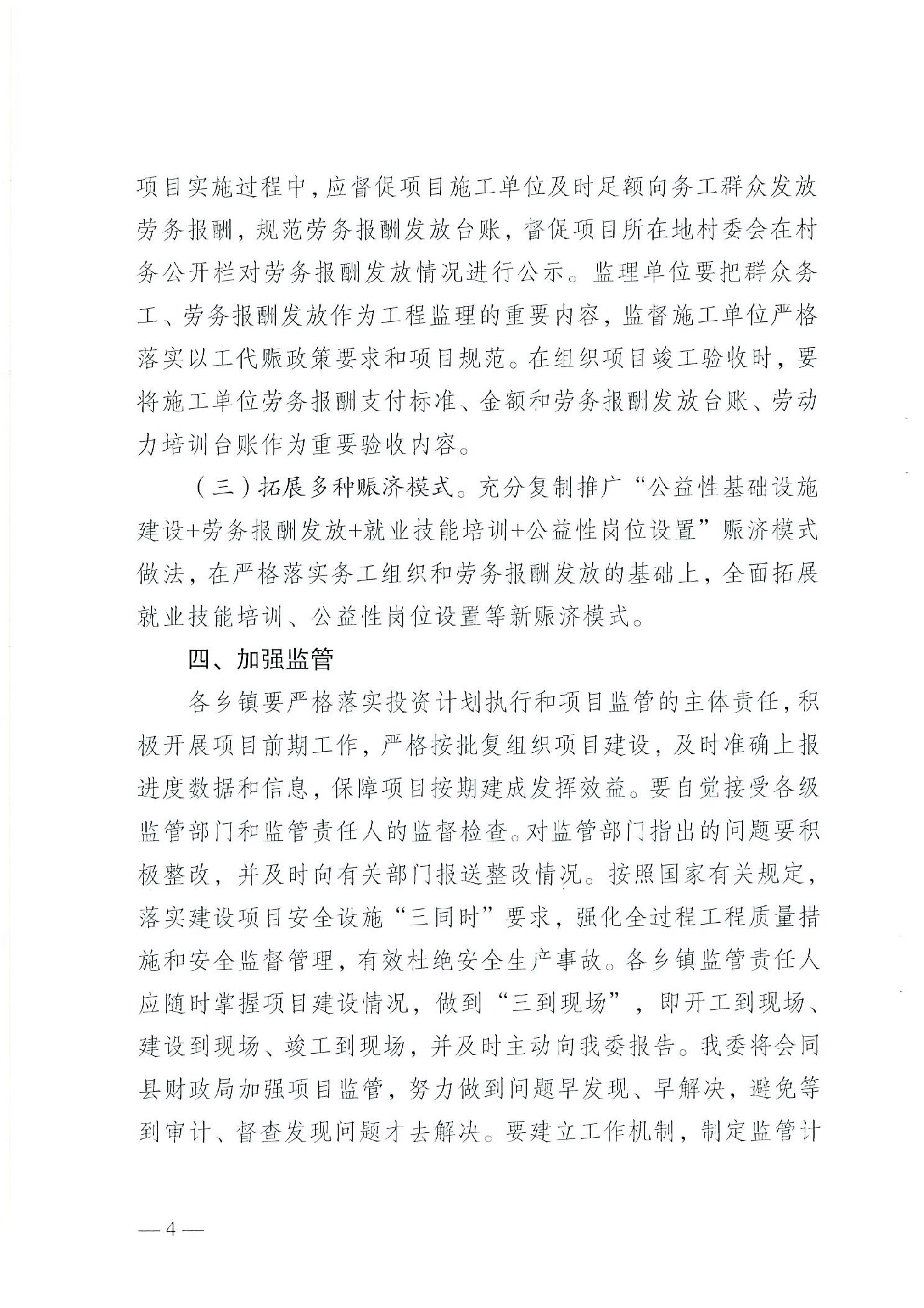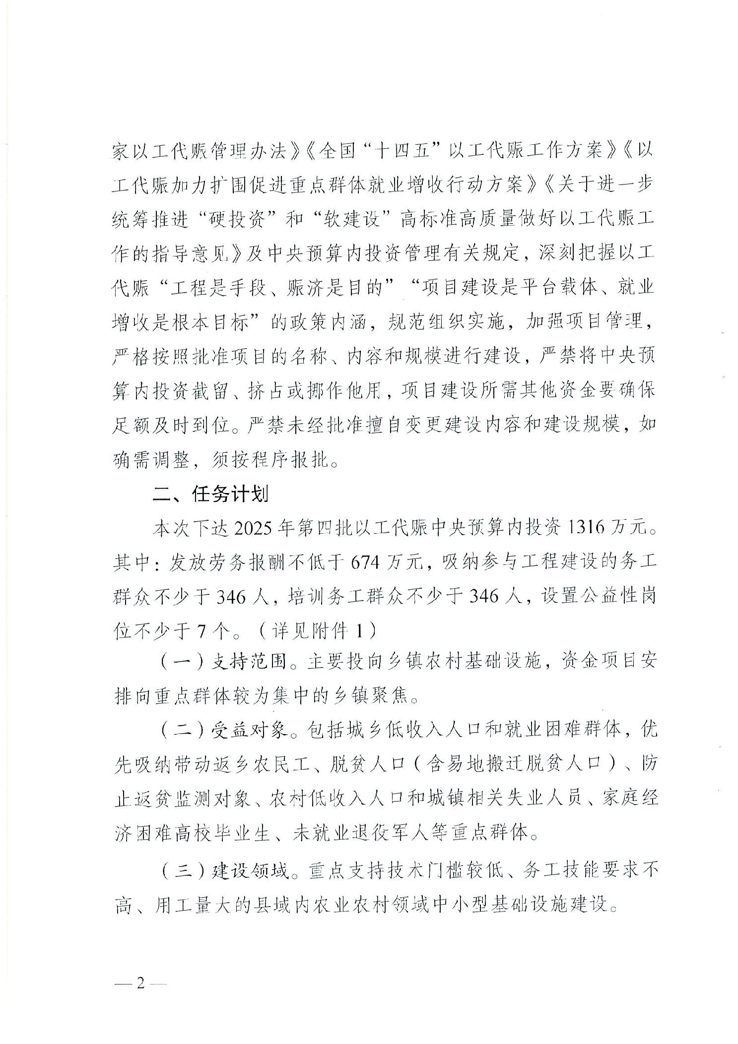 实施一批以工代赈项目,在确保劳务报酬发放金额占中央投资的总体比例达到40%以上的基础上,尽可能进一步提高占比,广泛吸纳返乡农民工、脱贫人口(含易地搬迁脱贫人口)、防止返贫监测对象、农村低收入人口和城镇相关失业人员、家庭经济困难高校毕业生、未就业退役军人等重点群体参与工程建设,实现就地就近就业增收。 | ||||