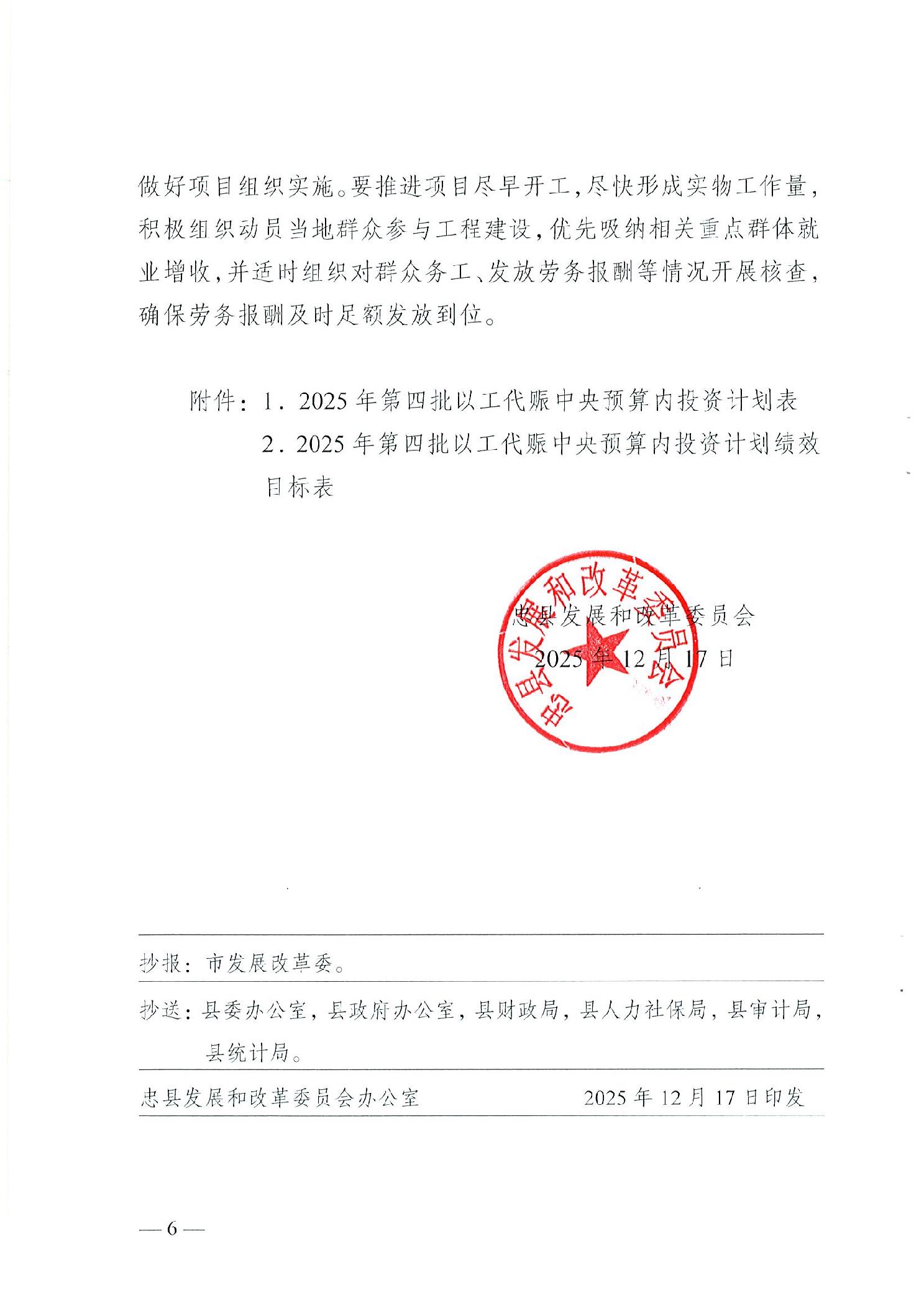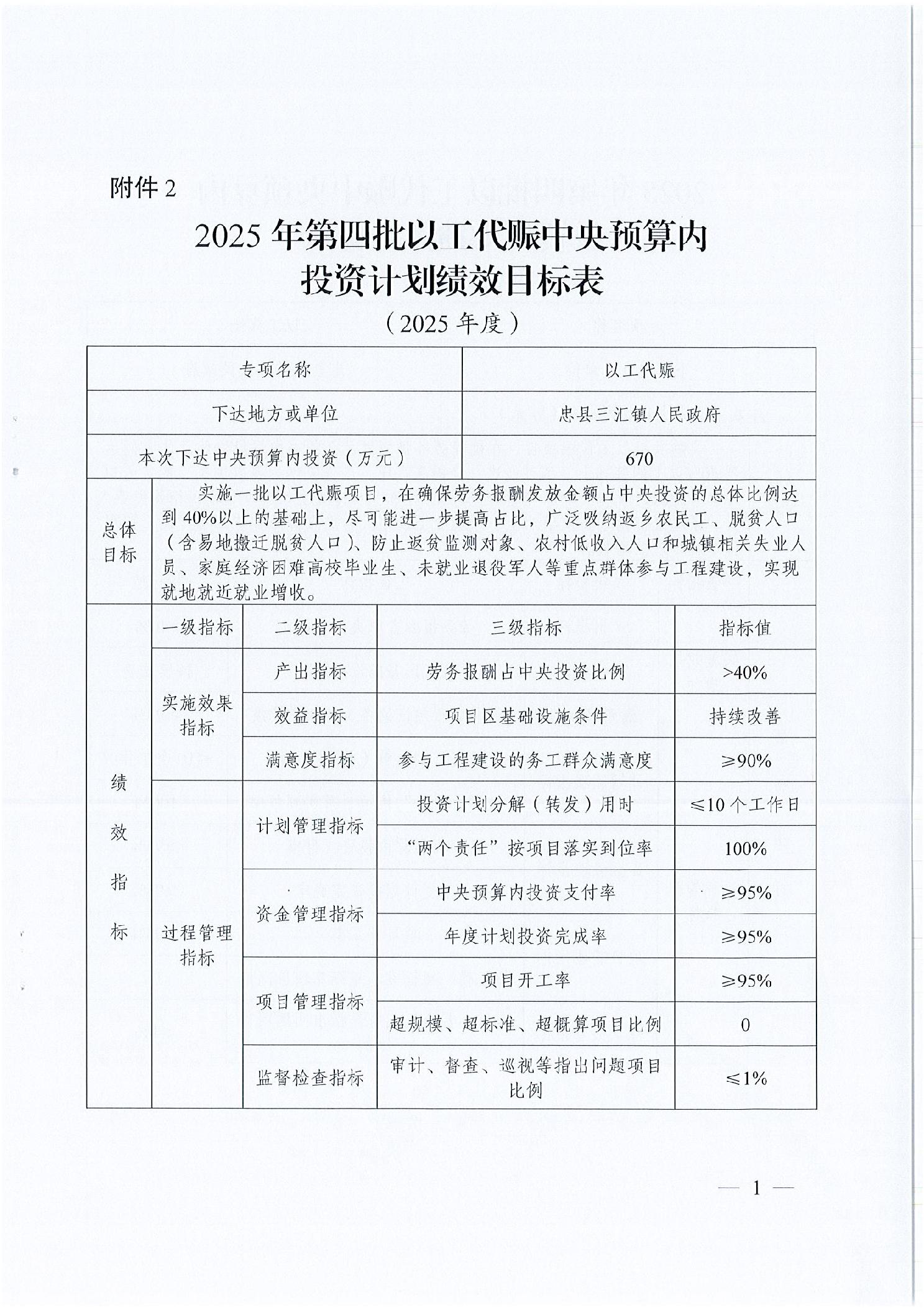 | 31 | 忠县 | 忠县三汇镇2026年基础设施水毁修复以工代赈项目 | 农业农村类 | 改建 | 水毁基础设施修复。 | 场地硬化8600平方米;改造挡土墙2500立方米;改建农村水毁公路宽4.5米,长4.5公里等。 | 2025年12月 | 2026年12月 | 总投资 | 710 | 710 | 直接投资 | 三汇镇人民政府 | 雷志雄 | 忠县发展和改革委员会 | 伯峥嵘 | 170 | 70 | 26 | 66 | 5 | 2 | 1 | 340 | 170 | 4 | 公益类 | 不招标 | 村集体经济组织领办的村级劳务合作社、劳务公司、项目理事会等 | |||
