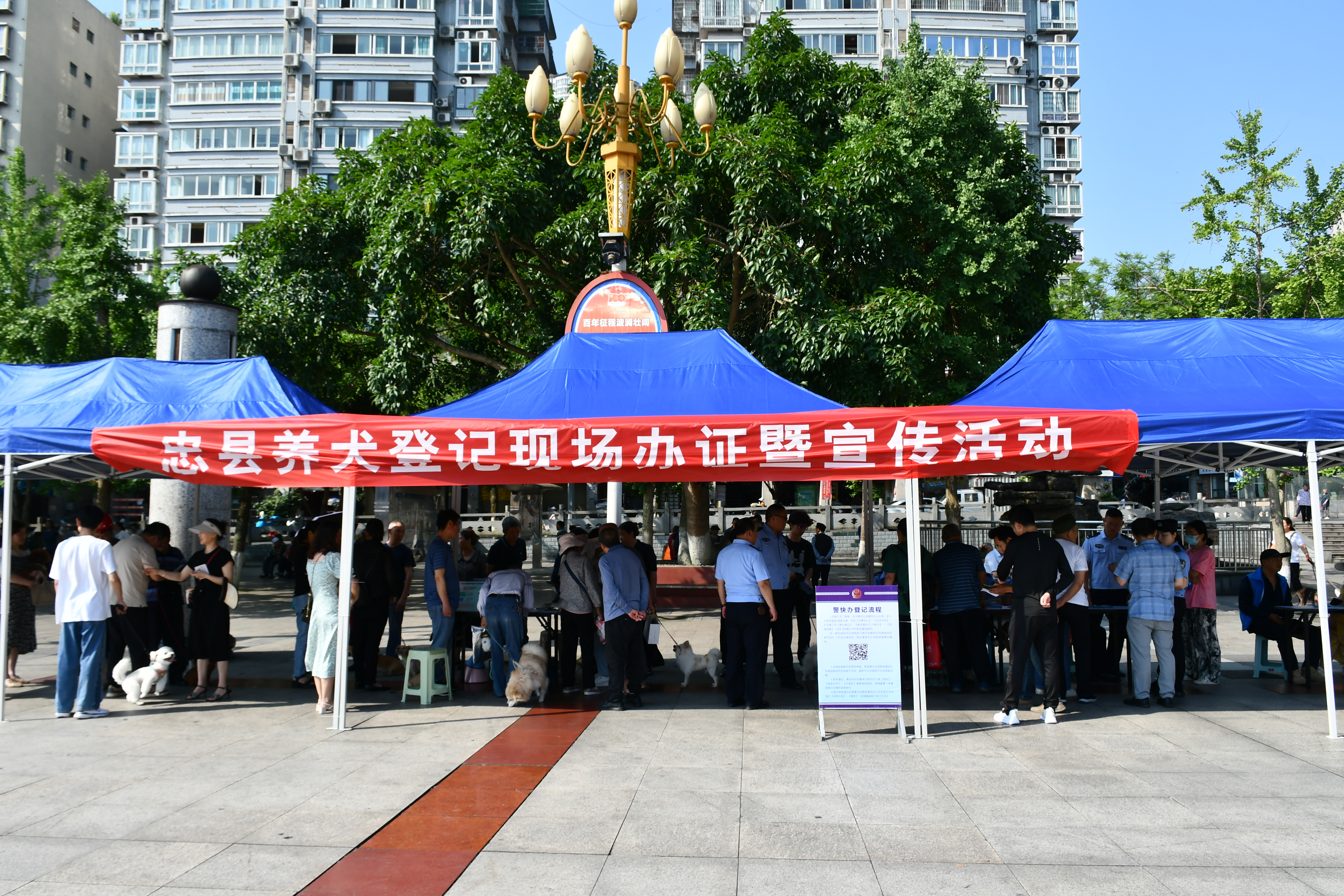 “落实养犬条例,构建和谐忠州”,为方便广大养犬市民养犬登记,忠县公安局大力推行注射疫苗、植入芯片、登记办证“一站式”办理方式,切实做深做实养犬管理服务工作。近日,忠县公安局治安大队牵头协同忠州第一派出所、忠州第二派出所、白公派出所,联合忠州街道、白公街道、县农业农村委以及忠县宜宠家动物诊所,在忠县忠州街道忠州广场开展忠县养犬登记现场办证暨宣传活动。