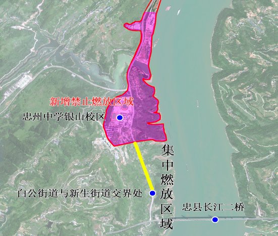 将忠义大道外侧漕溪河空坝(原集中燃放区域)调整至忠州中学银山校区往长江二桥方向0.45至1.3公里(白公街道与新生街道道路分界处)。