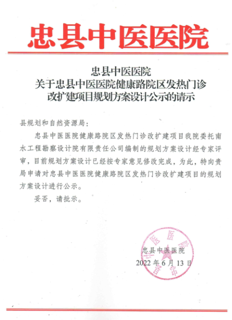 附件:1、忠县中医医院健康路院区发热门诊改扩建项目建设总平面图2、透视图3、公示申请4、经济指标。