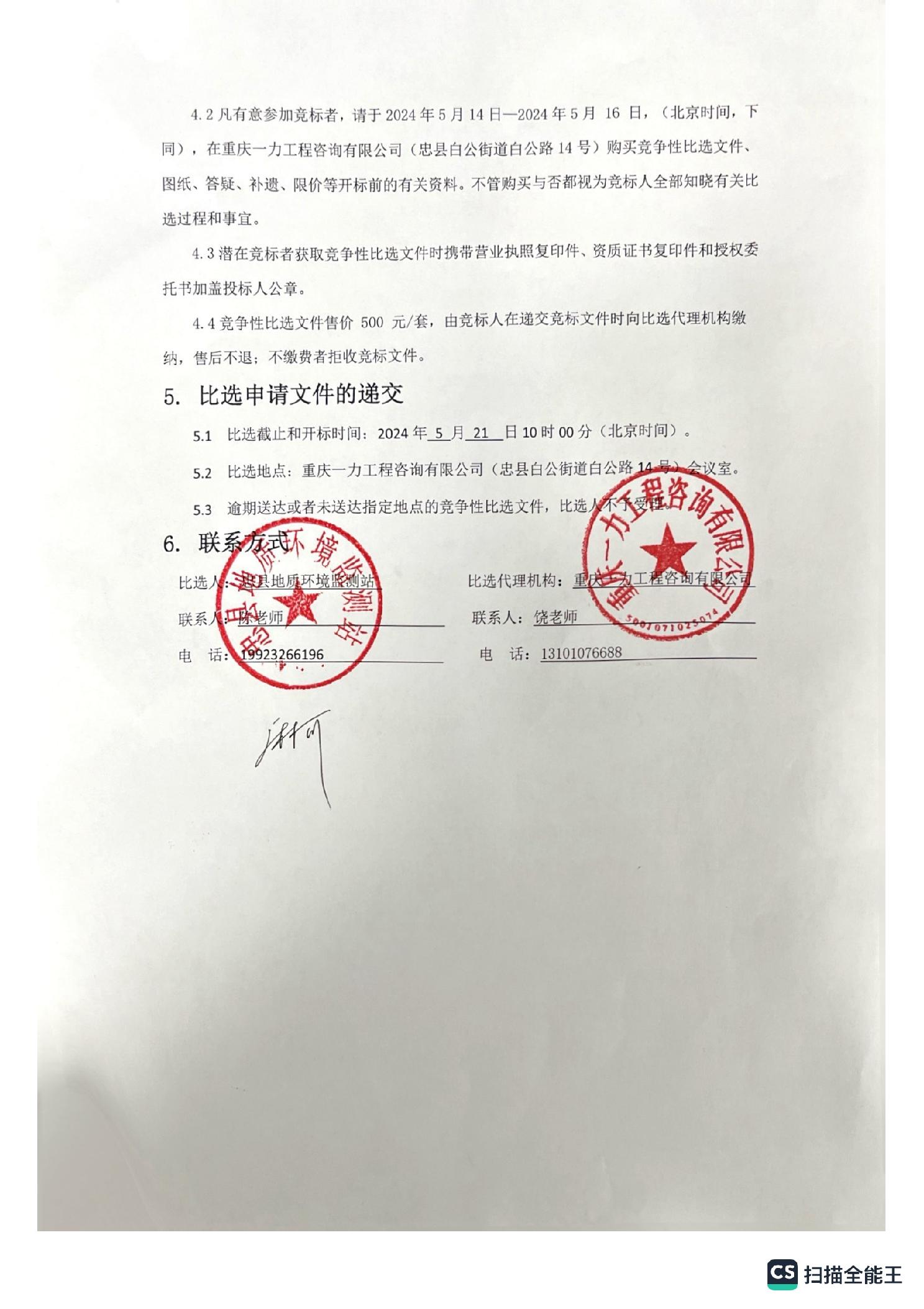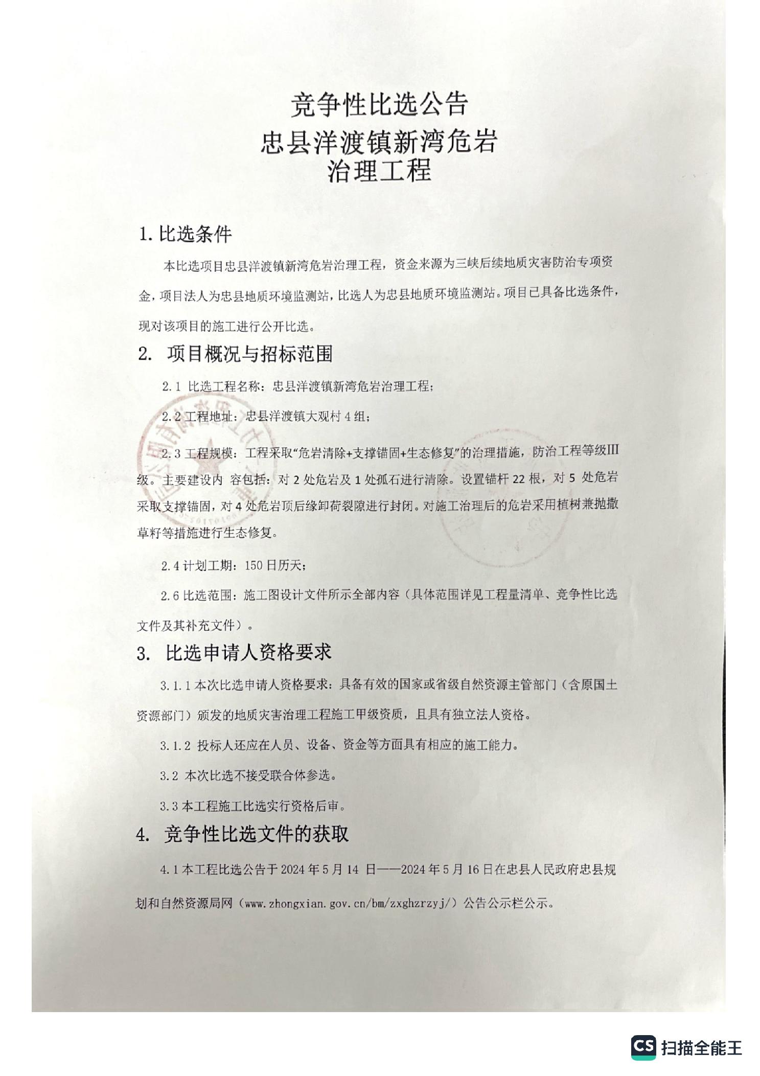 忠县洋渡真新湾危岩治理工程竞争性比选公告
