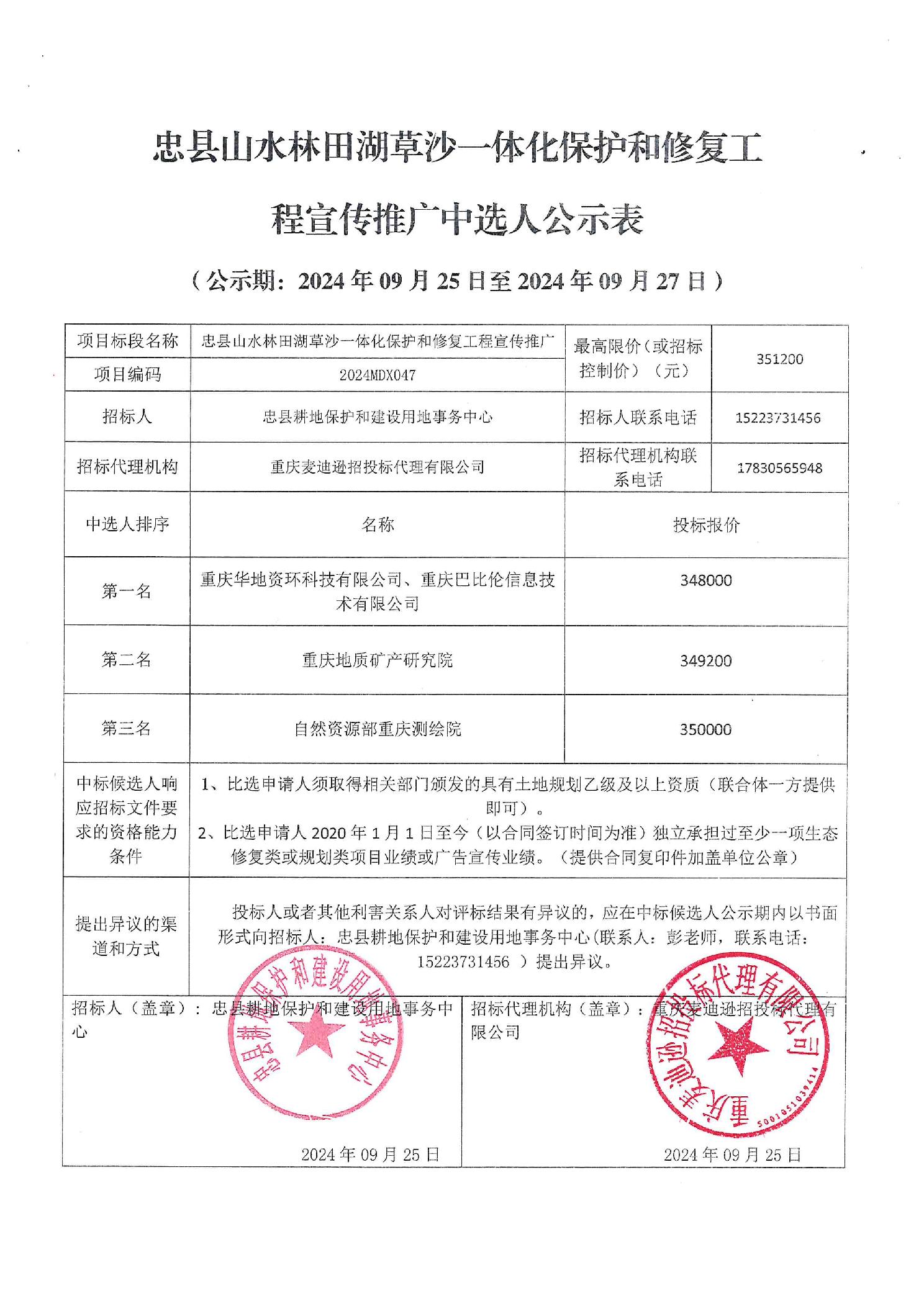 忠县山水林田湖草沙一体化保护和修复工程宣传推广中选人公示表