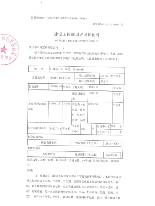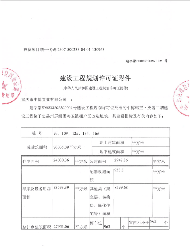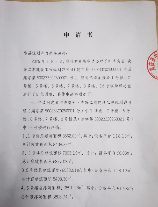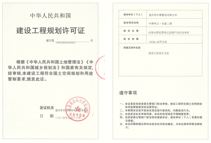 注销内容:注销中博鸣玉.央著二期建设工程项目建设工程规划许可证(建字第500233202500001号)及(建字第50023320250021号)局部内容。