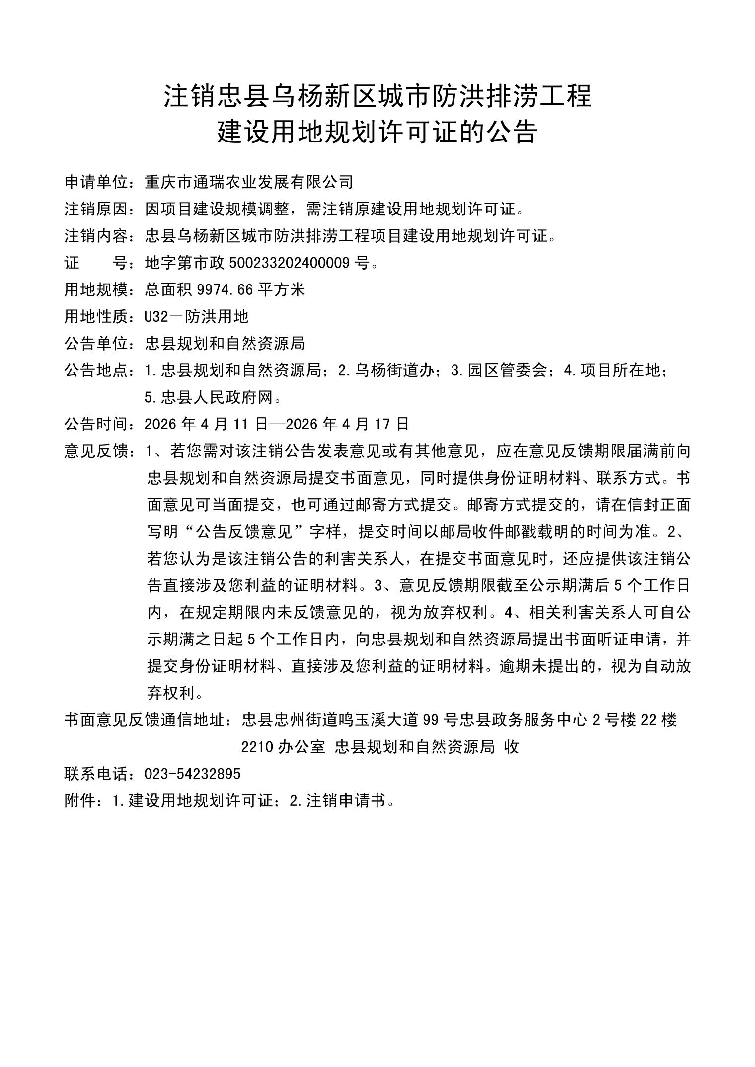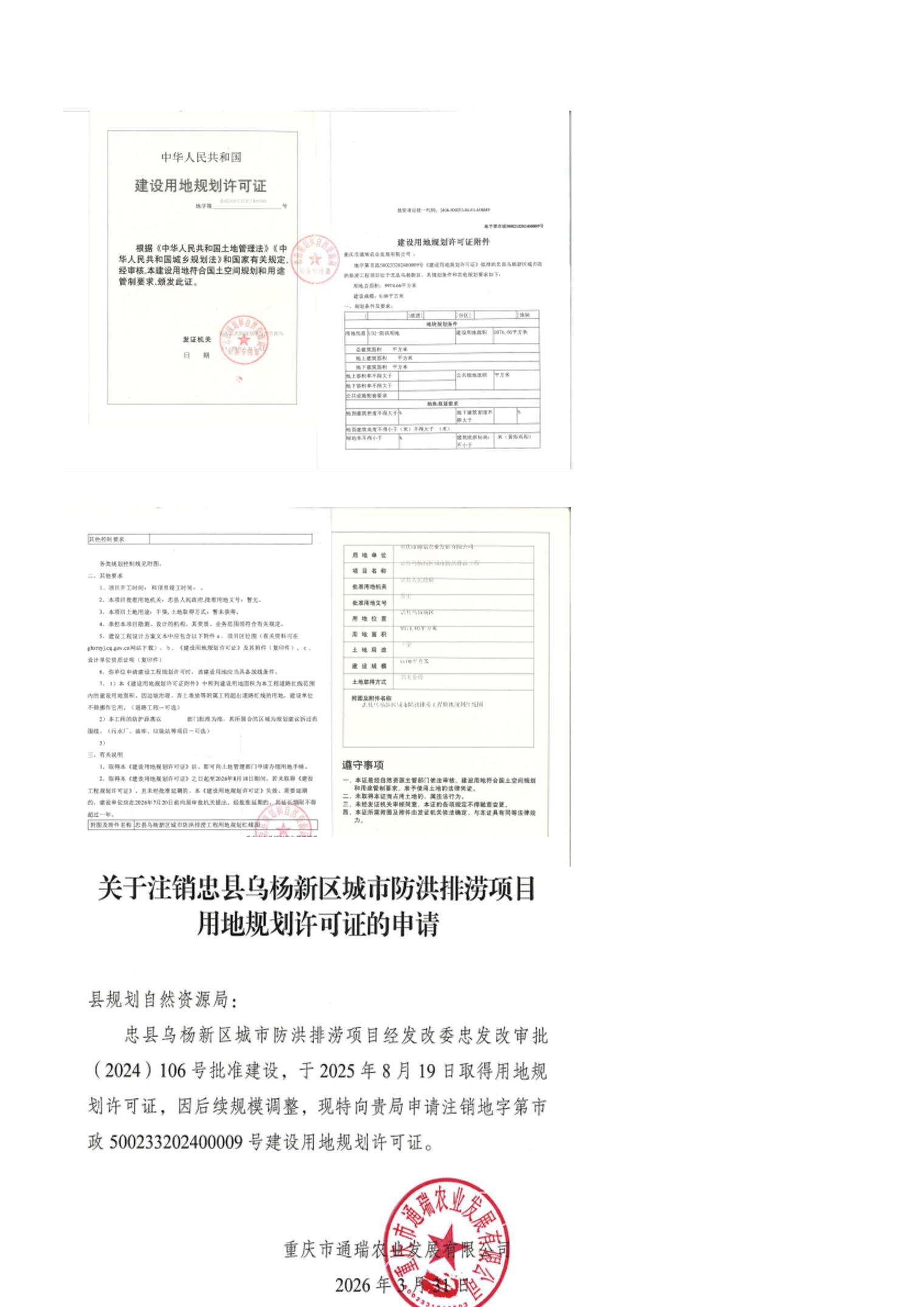注销忠县乌杨新区城市防洪排涝工程建设用地规划许可证的公告