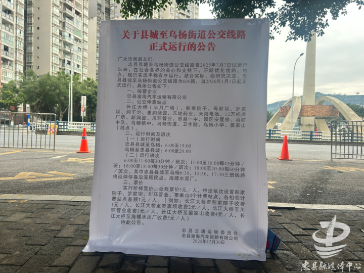 1月1日正式投入运营的忠县城区至乌杨街道的606路公交车,已平稳运行十余天。这一承载着乌杨片区近10万名群众期盼的民生实事落地见效,标志着忠县城区与乌杨片区的交通联系迈入便捷高效的公交时代。
