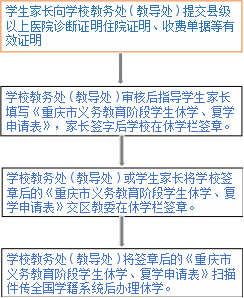 (一)因病假休学由学生法定监护人持县级以上医院诊断证明、住院证明、收费单据等有效证明,到学校填写《重庆市义务教育阶段学生休学、复学申请表》(附件3),并经学校和教育行政部门签章同意。学校应通过电子学籍系统报教育行政部门核准后,完成电子学籍休学处理。学生休学期间,学校应为其保留学籍。