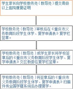 (二)学生休学期满或休学期间要求复学的,由学生法定监护人向学校提出申请,因病休学的还应当提交县级以上医院认定治愈或认定可以正常学习的证明,并在休学时填写的《重庆市义务教育阶段学生休学、复学申请表》上注明复学原因,并经学校和教育行政部门签章同意。学校应通过电子学籍系统报教育行政部门核准后,完成电子学籍复学处理。