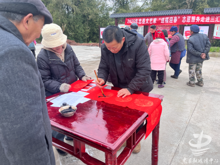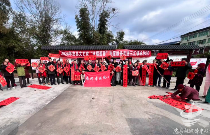 1月31日上午,忠县三汇镇永和村文化广场上热闹非凡,洋溢着欢声笑语。十余名书画爱好者专程来到村里,开展“送福迎春”志愿服务活动,现场为村民书写春联与“福”字,将手写的年味与真挚的祝福送到乡亲们家门口。
