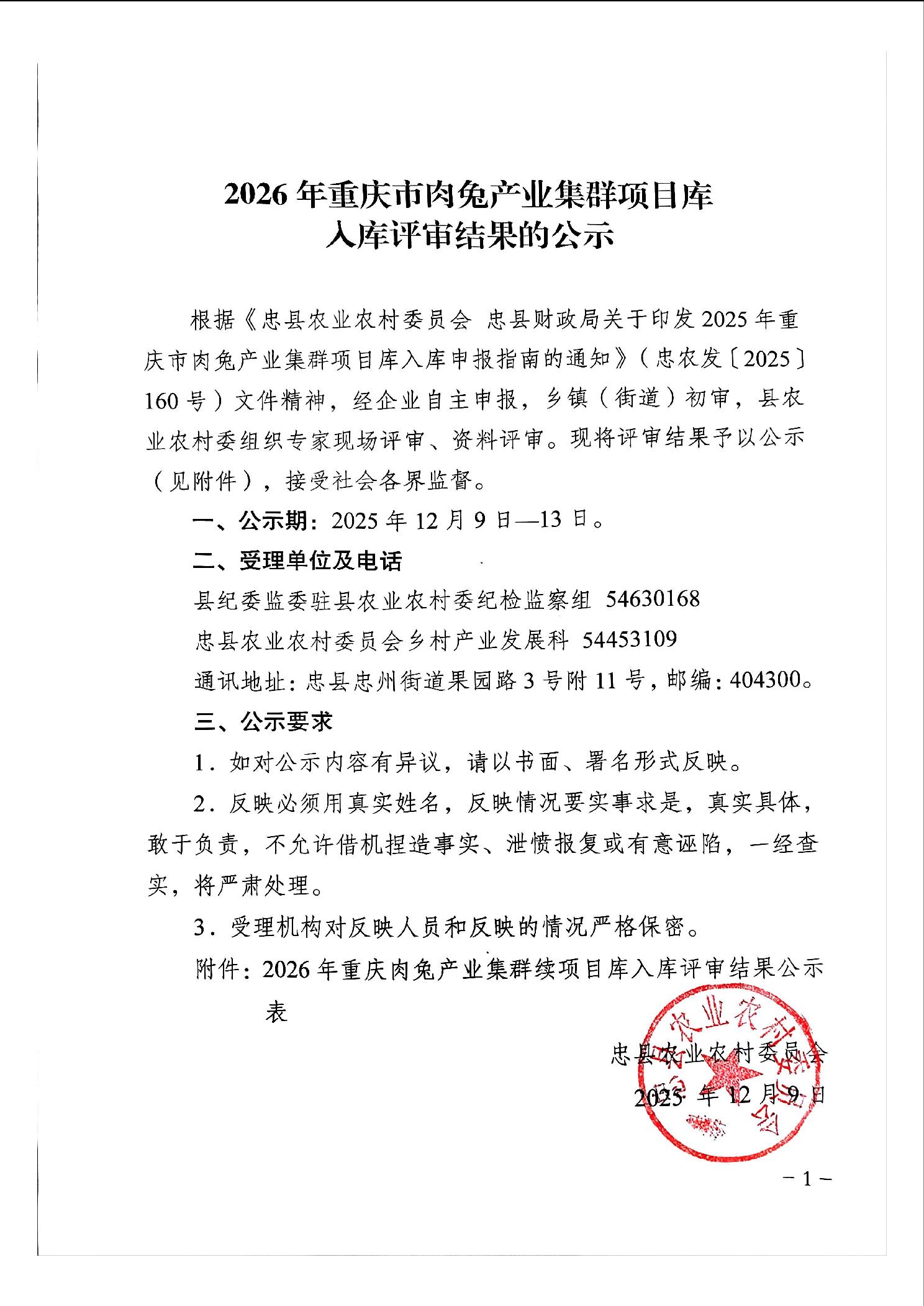 2026年重庆市肉兔产业集群项目库入库评审结果的公示