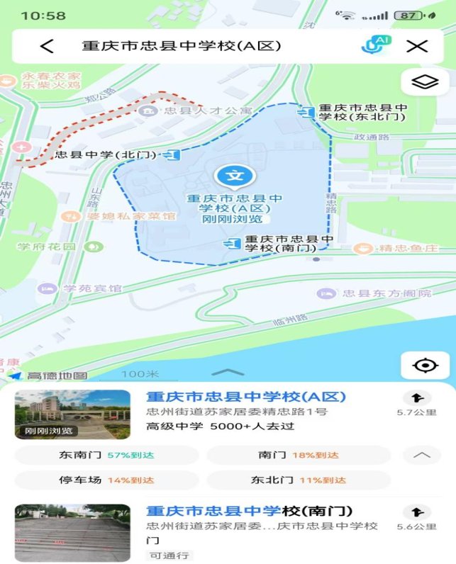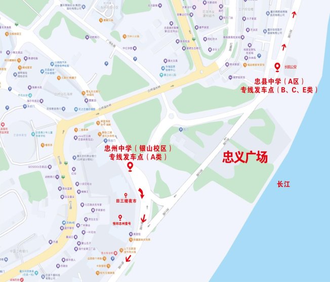 请使用导航软件导航至考点学校(A类考生导航到忠州中学银山校区,B类、C类、E类考生导航到忠县中学A区),考生车辆一律不允许进入考点学校,考点学校门口即停即走。
