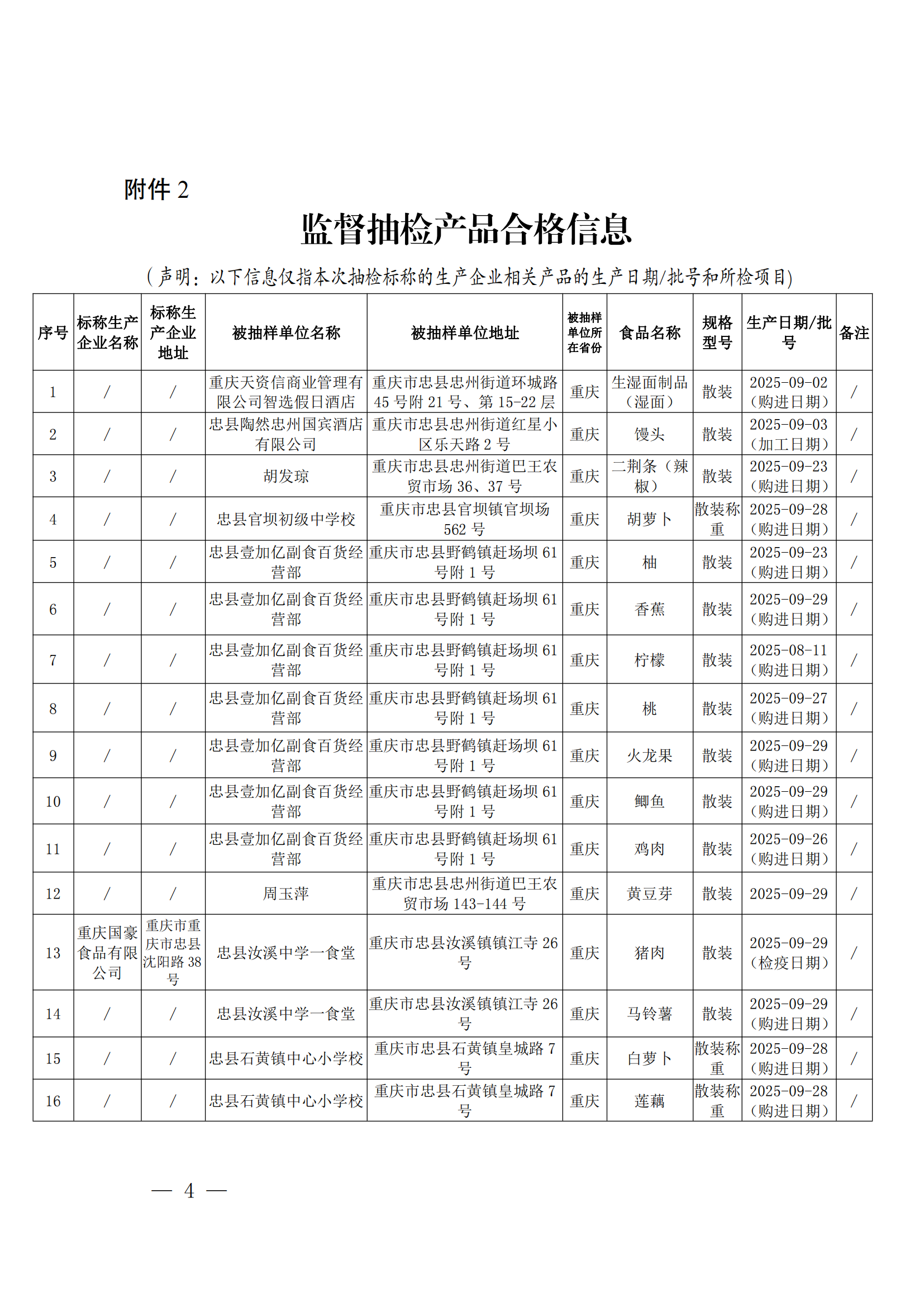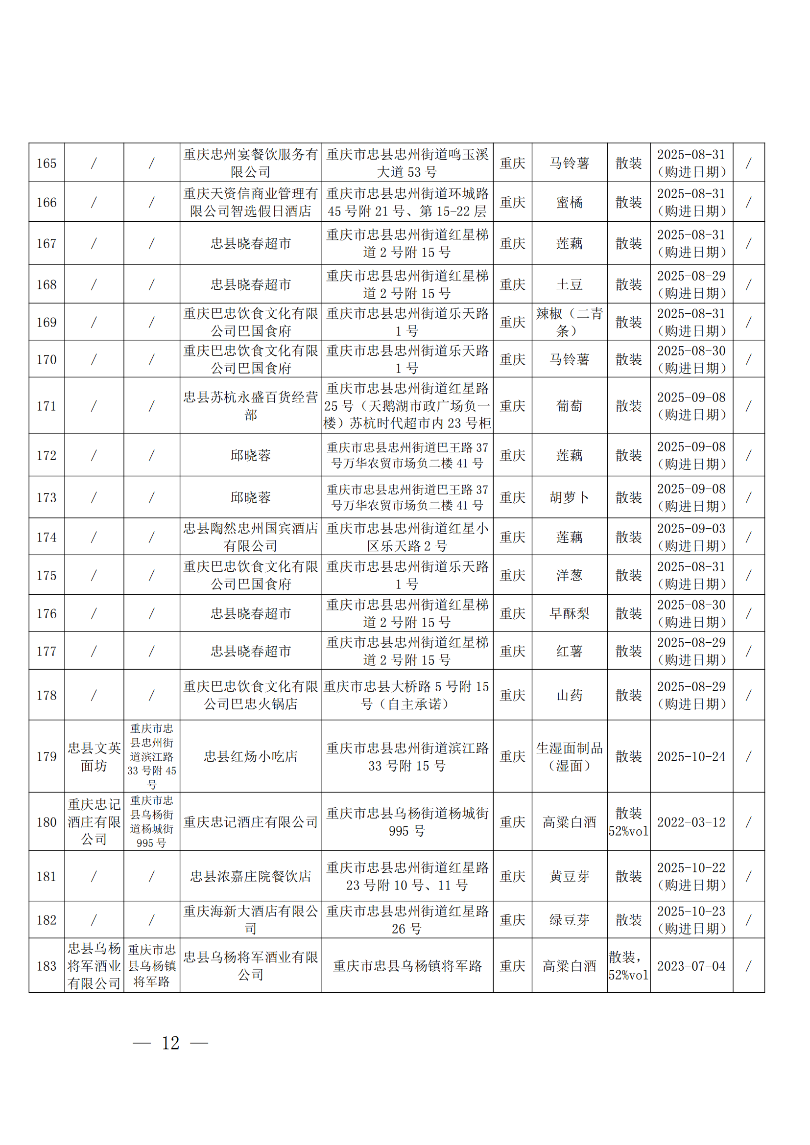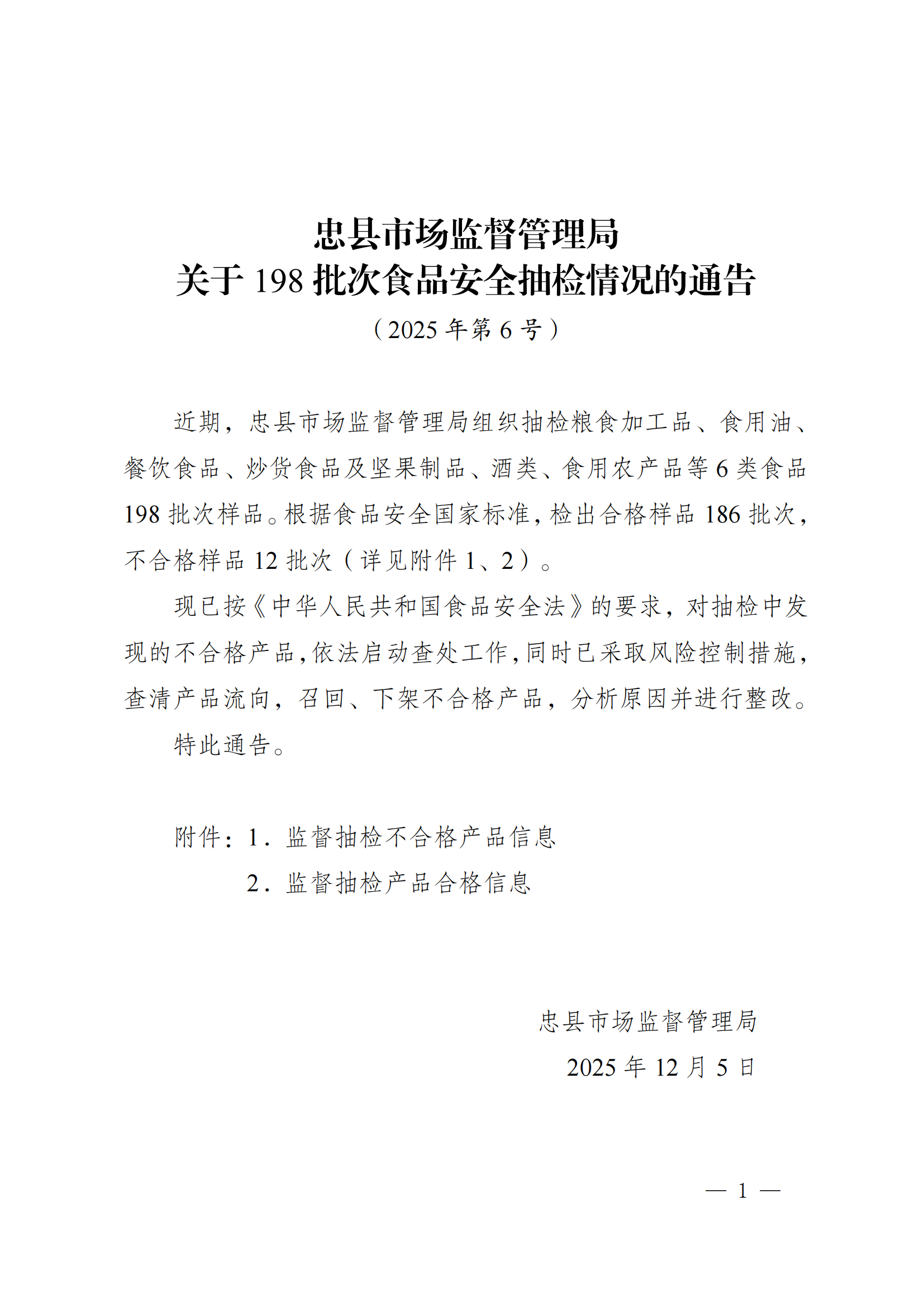 忠市监〔2025〕67号 忠县市场监督管理局关于198批次食品安全抽检情况的通告(2025年第6号)