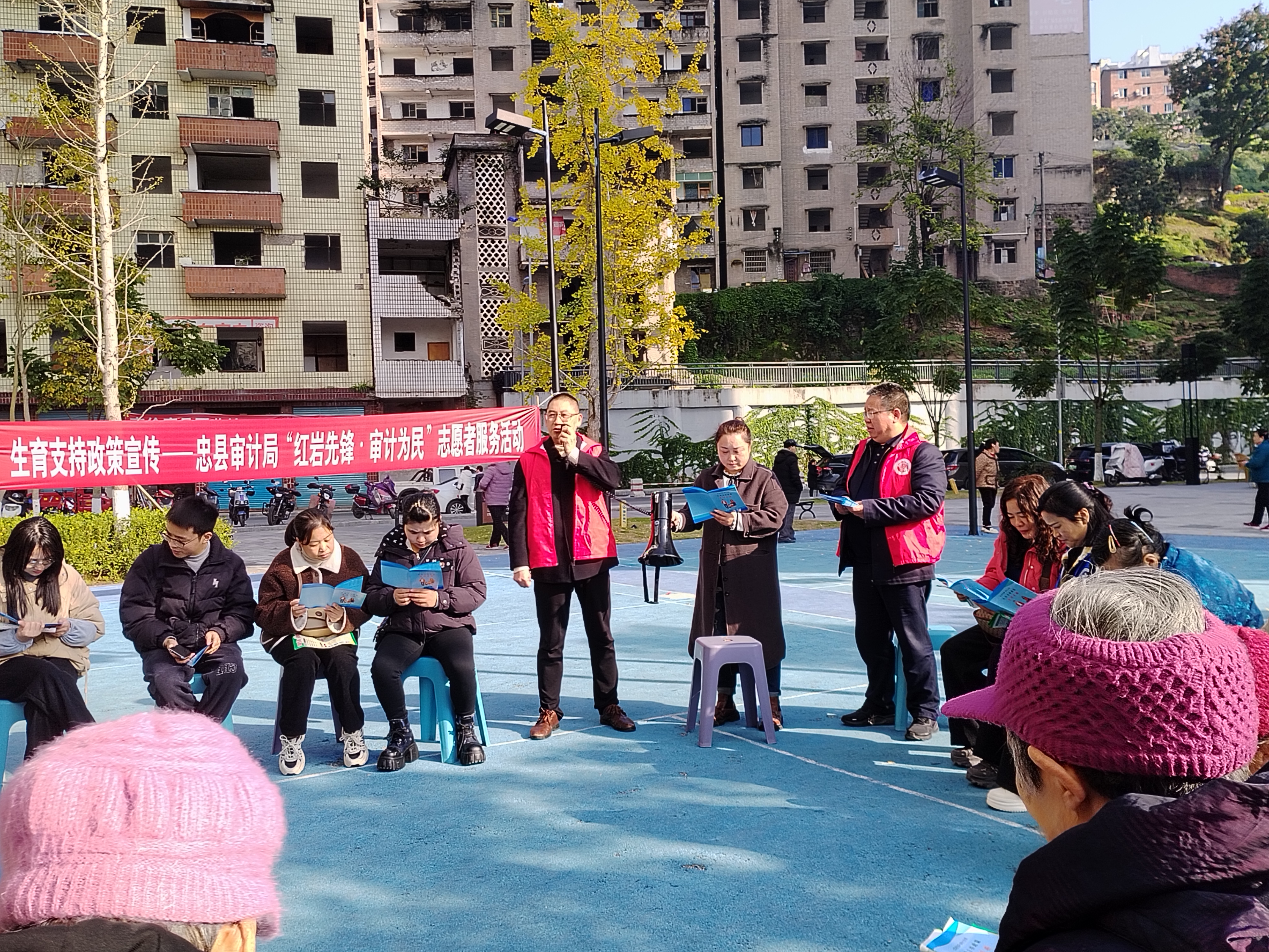 近日,忠县审计局以重庆市工伤保险和生育支持资金审计成果为依托,聚焦生育保险、育儿补贴等惠民政策,编制宣传手册,并联合忠县人力社保局、忠县医疗保障局深入鸣玉溪社区开展“红岩先锋·审计为民”志愿服务活动。活动中,志愿者通过在院坝会上精准解读政策、向居民发放宣传手册和向社区赠送宣传手册等方式,把政策送到群众身边,切实以审计监督推动惠民政策落地见效。(图为院坝会宣讲政策现场)