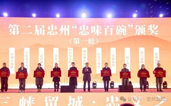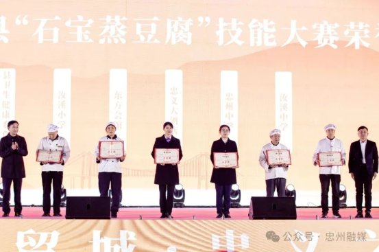 启动活动中,忠州街道、白公街道、官坝镇、黄金镇、磨子土家族乡负责人分别推介本地美食,市餐饮行业协会负责人发布了《渝菜忠县石宝蒸豆腐团体标准》。现场领导为“忠州美食推荐官”颁发了聘书,为渝菜忠县“石宝蒸豆腐”技能大赛获奖单位、第二届忠州“忠味百碗”特色宴席入选单位、第二届忠州“忠味百碗”入选单位颁发了奖牌。