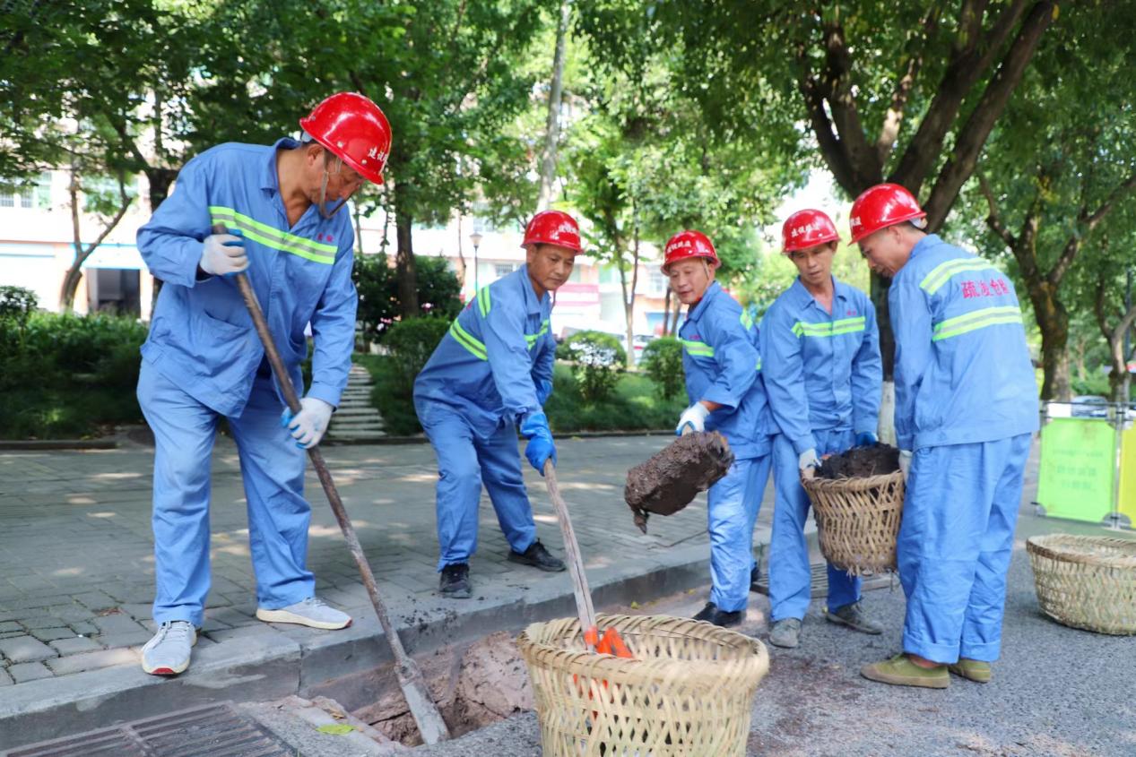 7月12日下午,忠县住房城乡建委疏浚队工人正在县城环城路车行道边开展雨水井清淤工作。当天,忠县室外气温显示达40摄氏度。