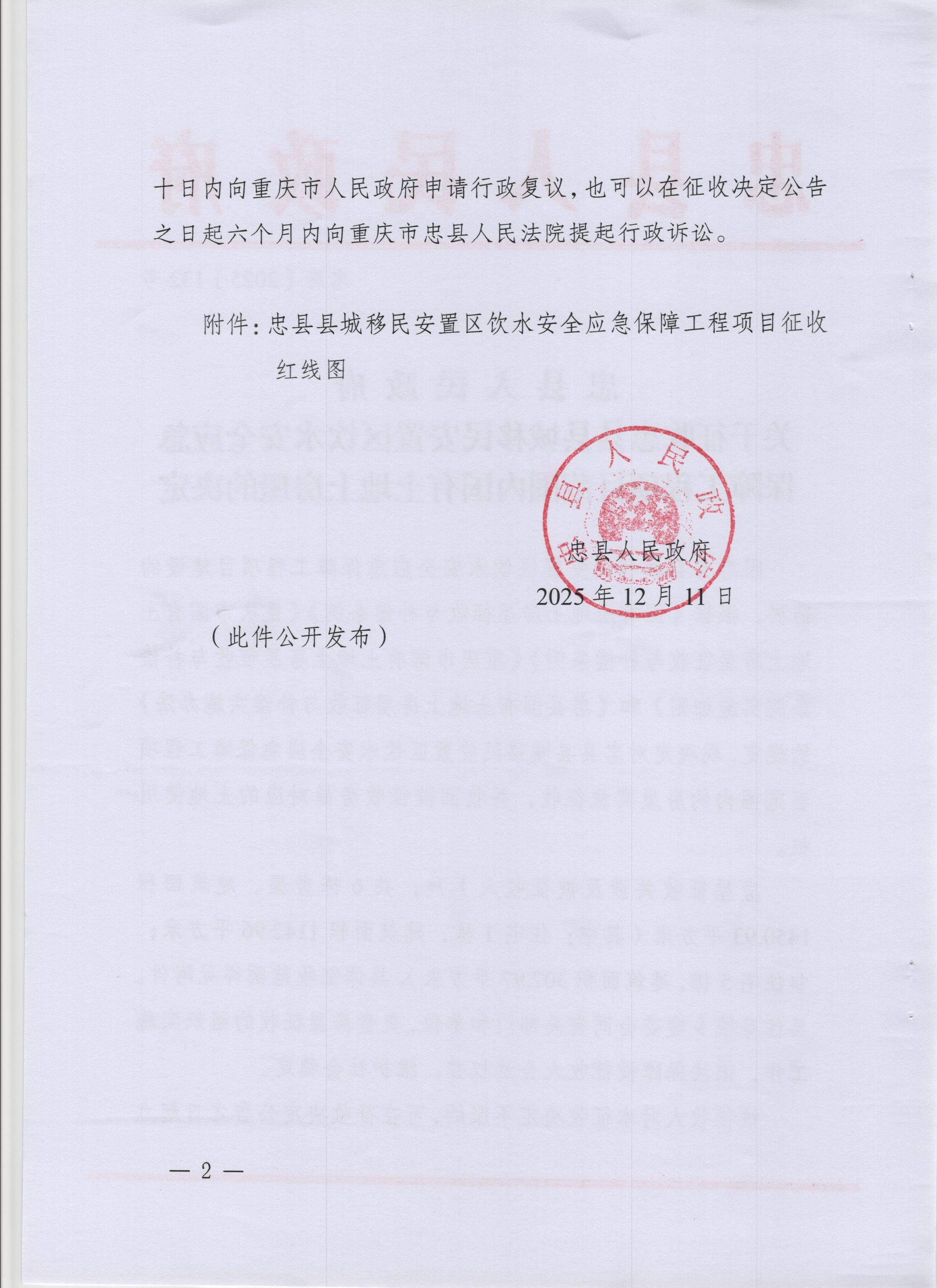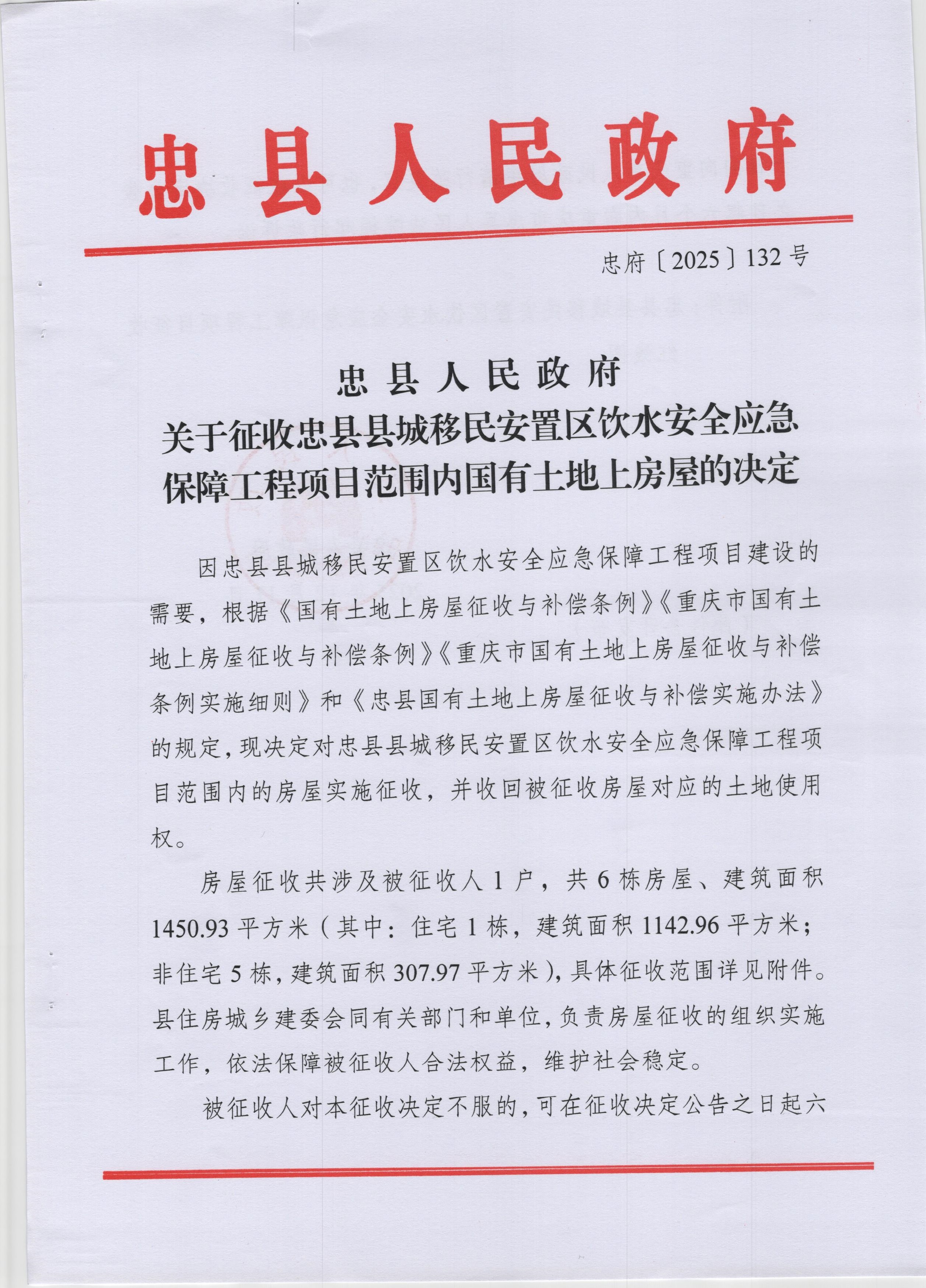 忠县人民政府关于征收忠县县城移民安置区饮水安全应急保障工程项目范围内国有土地上房屋的决定