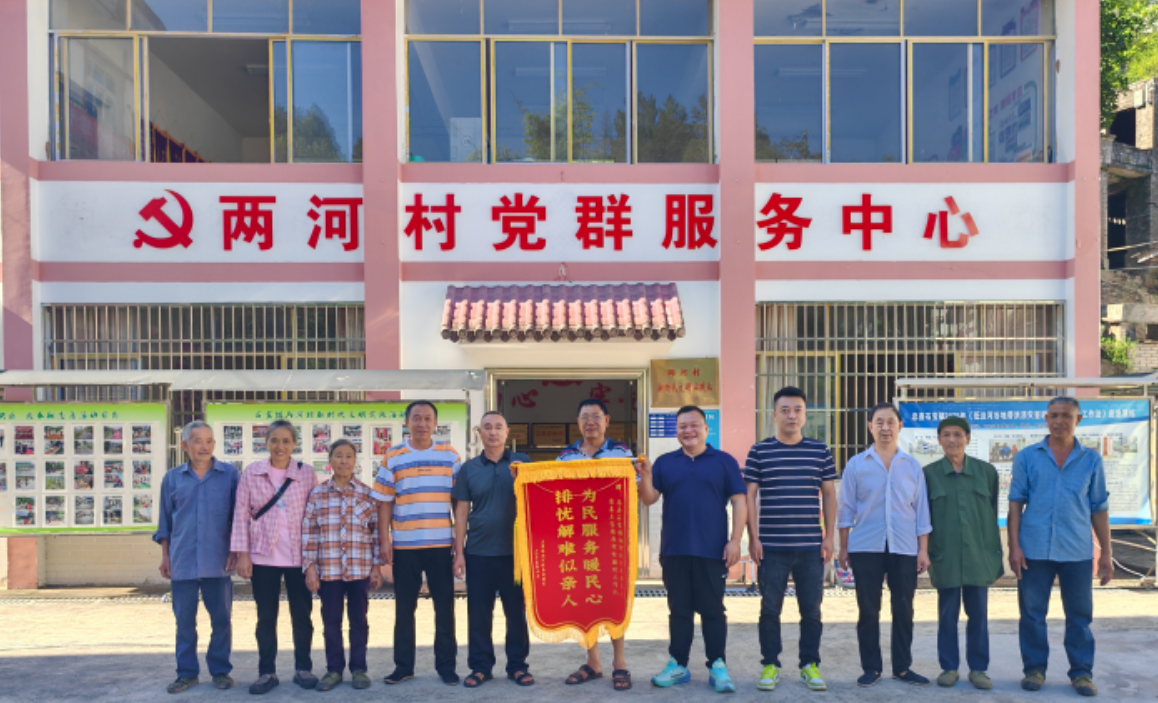 近日,石宝镇两河村五组组长吴建华带领几名村民代表,将写有“为民服务暖民心 排忧解难似亲人”的锦旗送到两河村村委会干部手中,感谢村干部为五组村民增设饮水管网。