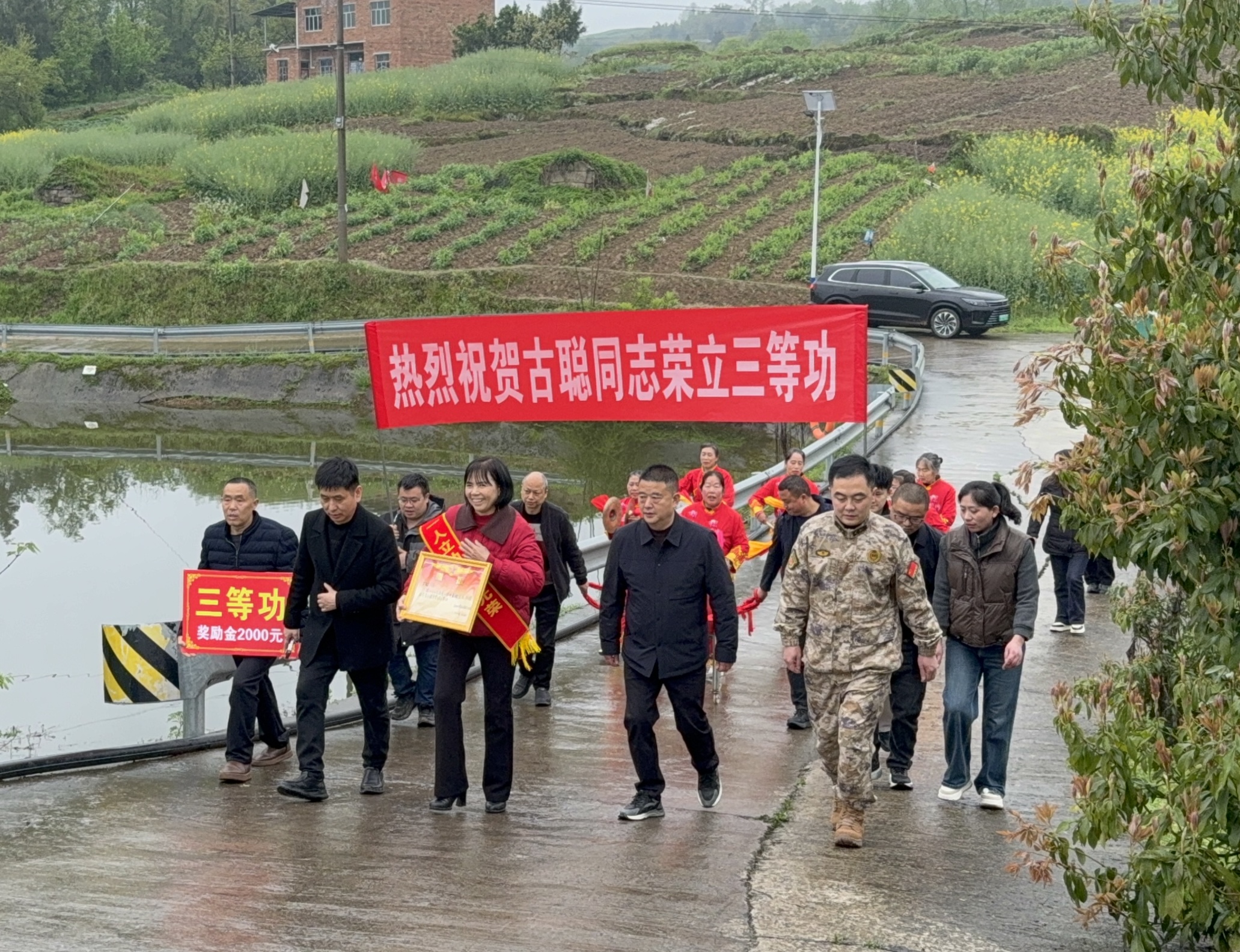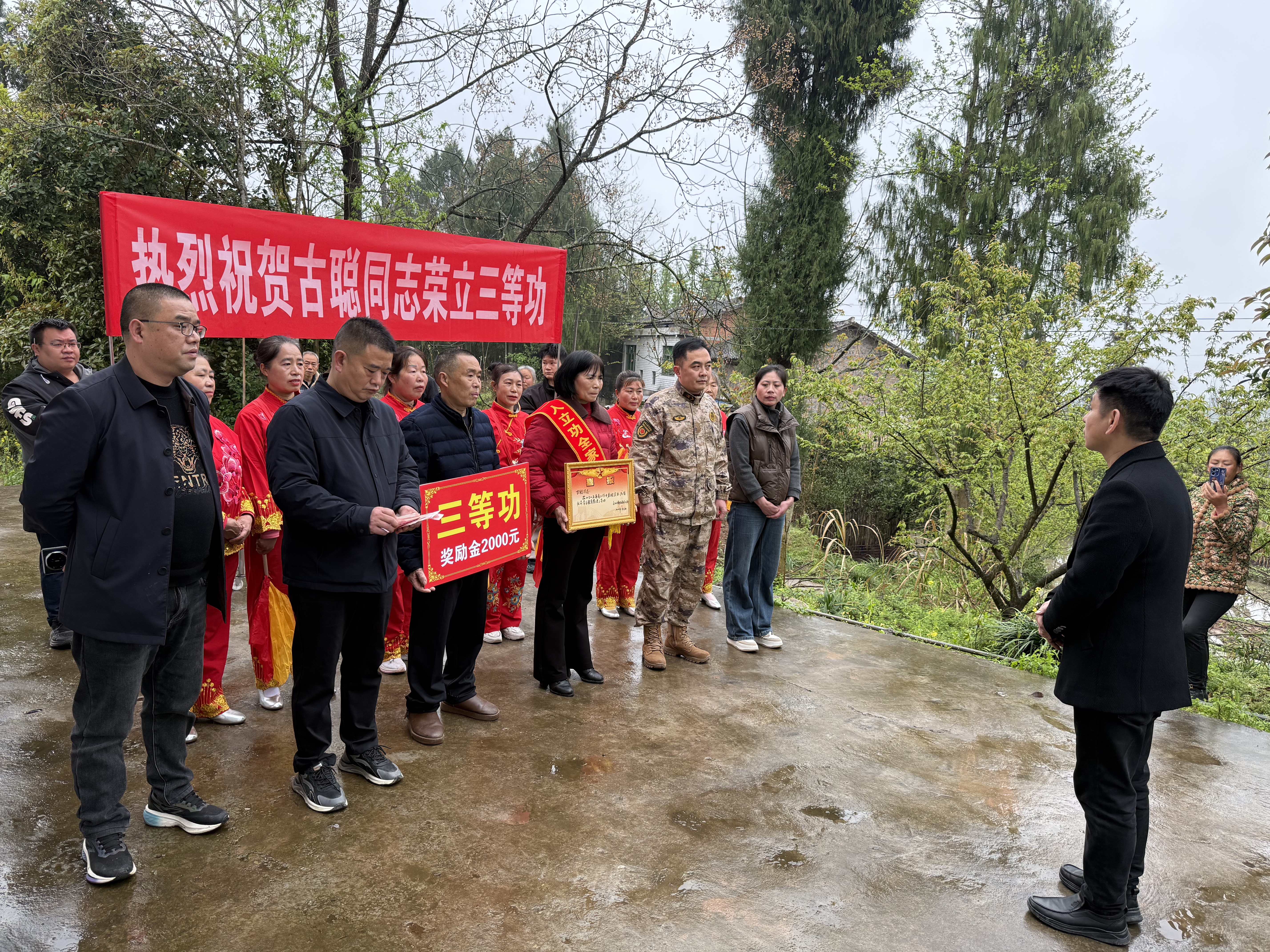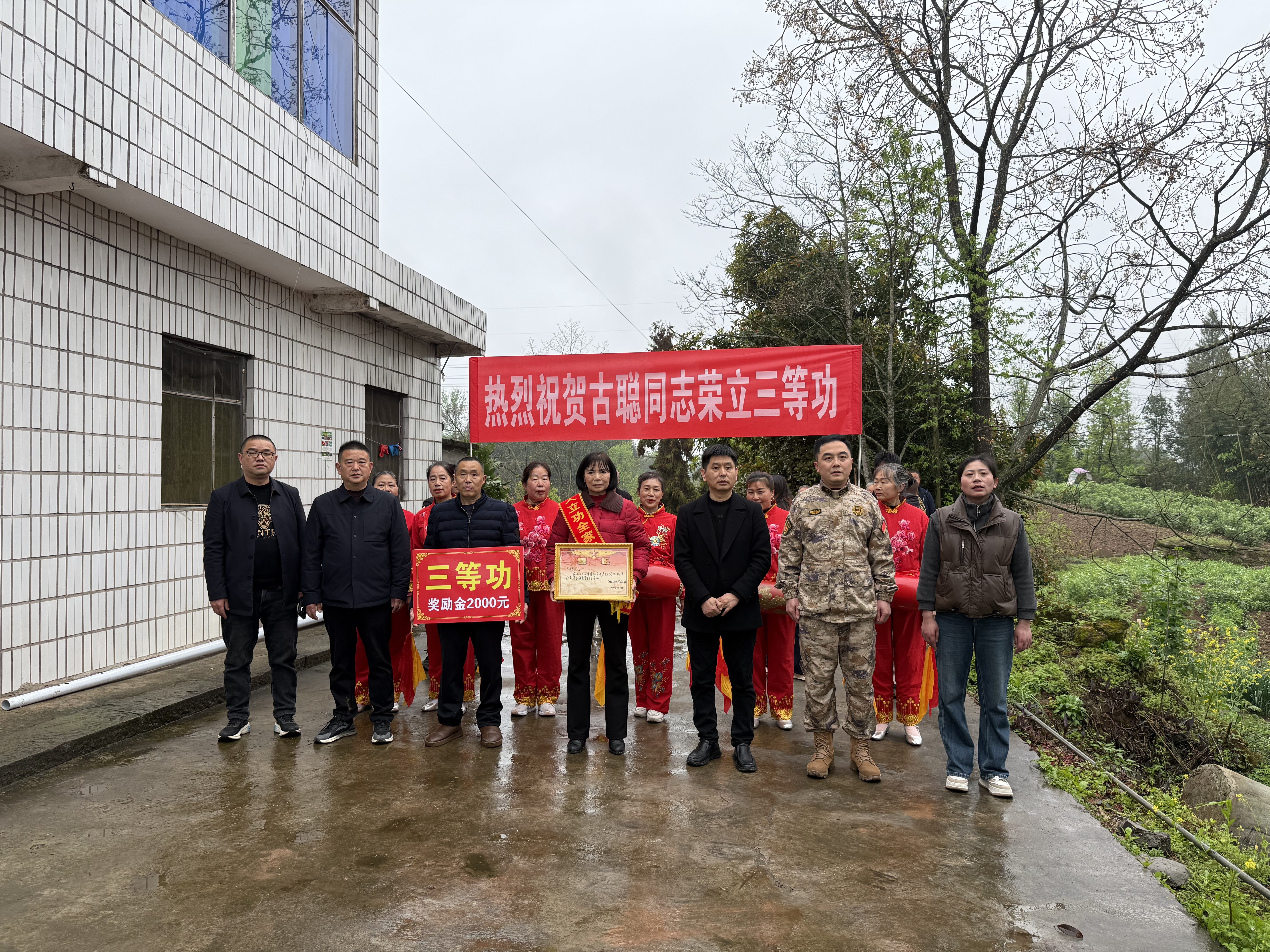3月24日上午,双桂镇党委书记 范景峰、人大主席任佳伶、人武部长李德福带队携镇人武部、便民服务中心、村干部一行,为荣立三等功的现役军人古聪家庭送喜报。以敲锣打鼓、高举横幅、佩戴绶带等形式,为荣立三等功的现役军人 家庭送上喜报和慰问金。镇领导与军属亲切交谈,感谢他们为国防事业培养优秀人才,并强调要持续做好拥军优属工作,切实解决军人后顾之忧。现场锣鼓喧天、气氛热烈,充分彰显了“一人立功、全家光荣”的浓厚社会氛围。