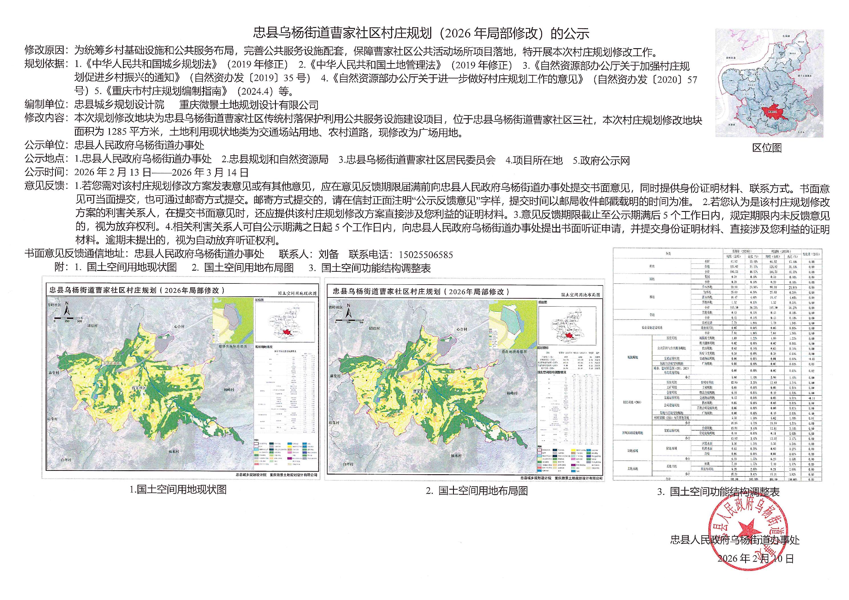 忠县乌杨街道曹家社区村庄规划(2026年局部修改)的公示