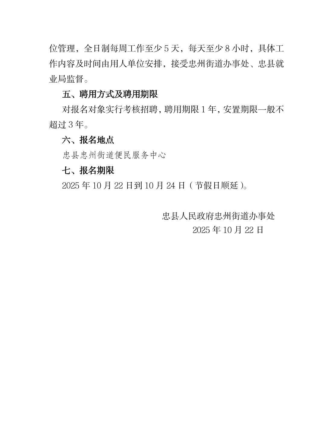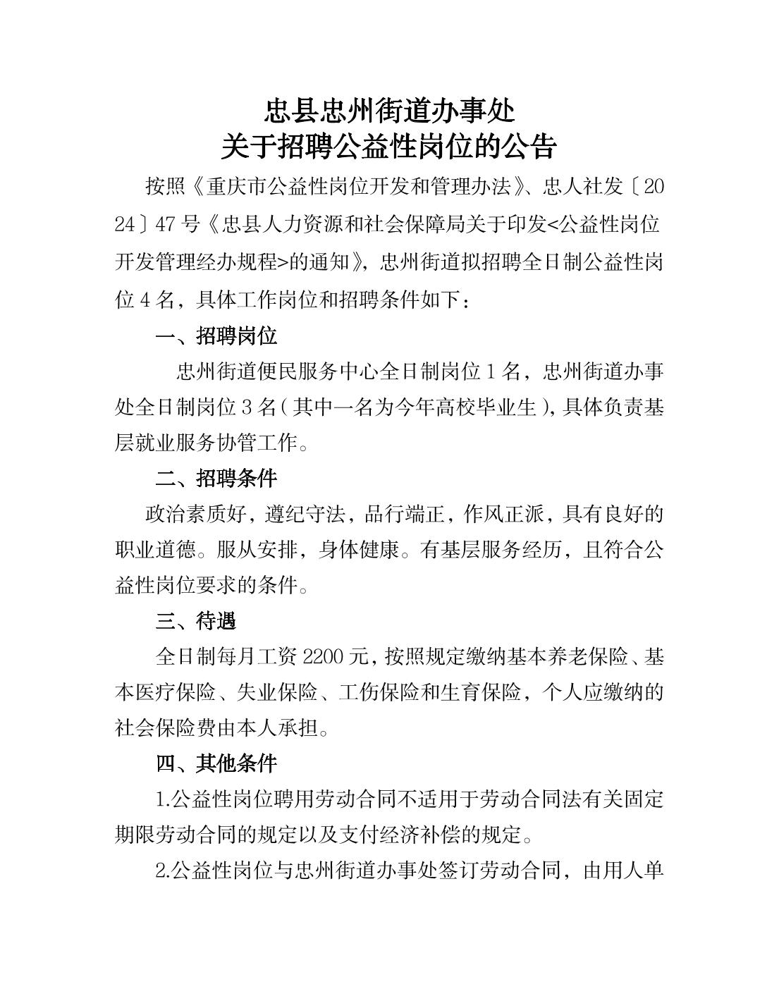 忠县忠州街道办事处关于招聘公益性岗位的公告