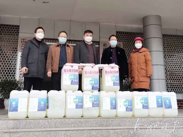 2月9日下午,拔山镇商会向拔山镇政府捐赠325公斤84消毒液,助力新冠肺炎疫情防控。这是拔山镇商会继1月28日捐赠物资后的第二次捐赠行动。