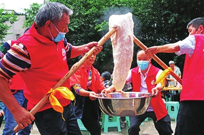 9月28日,忠州街道东坡路社区,居民相聚一起打糍粑、吃糍粑、品月饼,欢欢喜喜迎中秋。