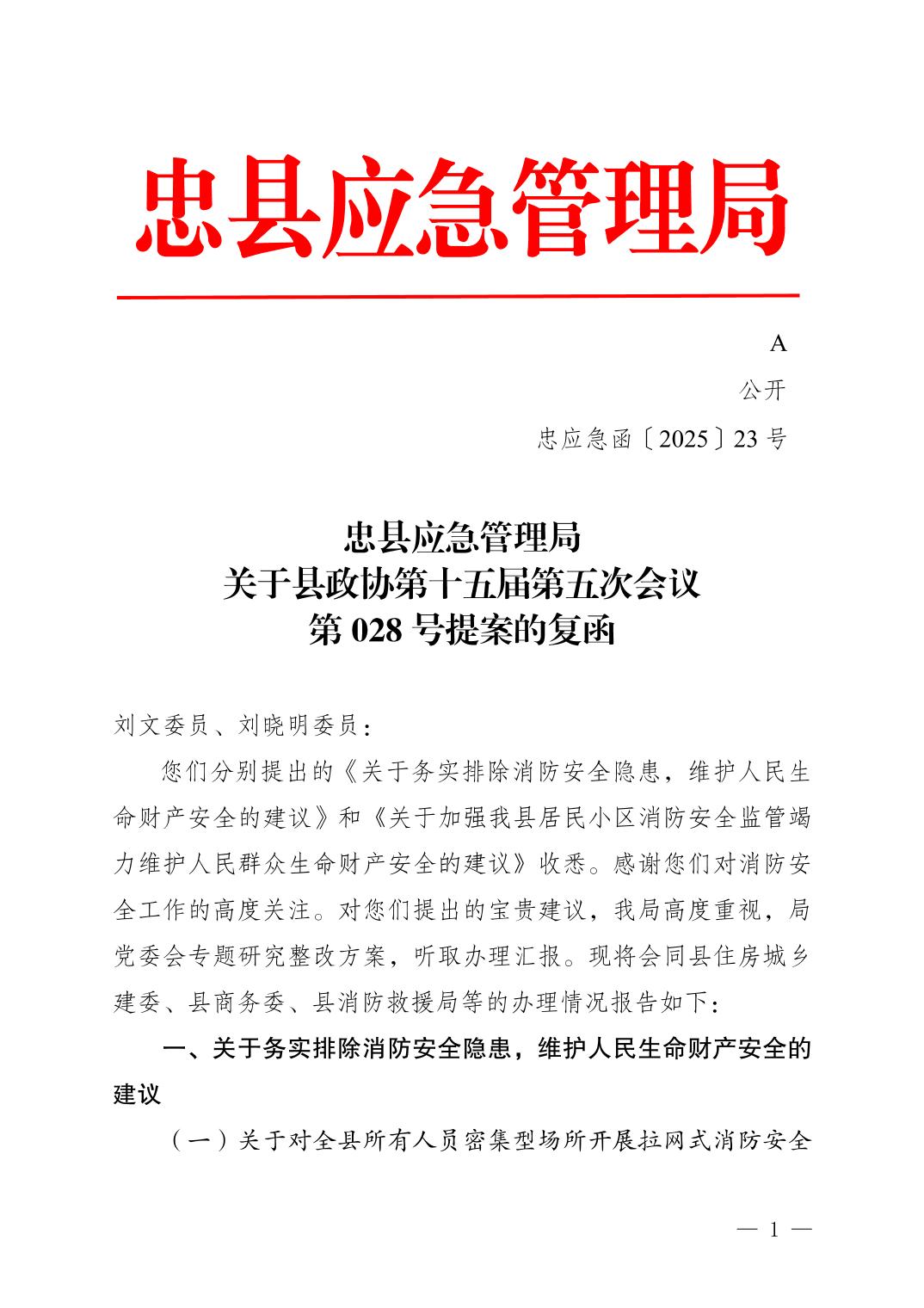 忠县应急管理局关于政协忠县第十五届委员会第五次会议第028号提案的复函