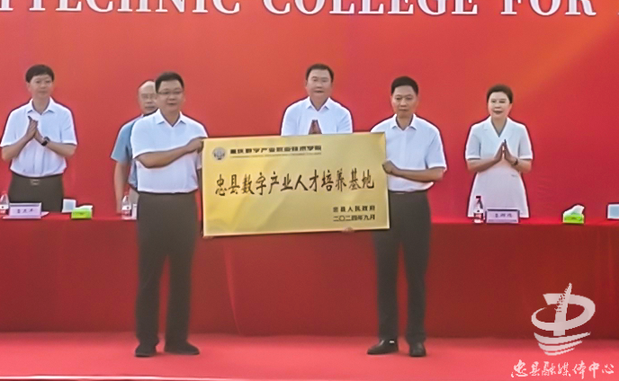 开学典礼上,徐海波为重庆数字学院授予“忠县数字产业人才培养基地”牌匾,学院师生代表发言。