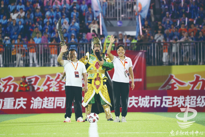 开赛前,三国武将“关羽”将足球送到球场中心,由2024年度中国好人、“感动重庆十大人物”秦大益、曹利芳开球。7时30分,随着主裁判哨响,比赛正式开始,忠县烽烟三国队与万州三峡银行队展开激烈对决。