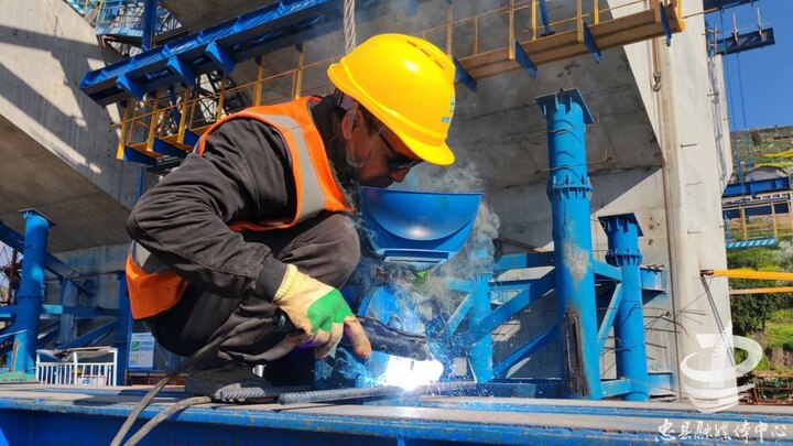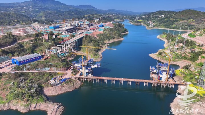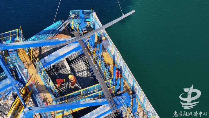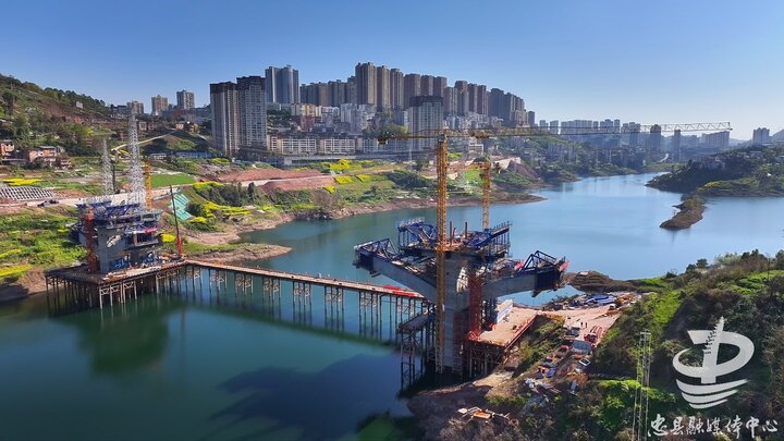近日,忠县站西大桥建设现场一派繁忙,工人在借助挂篮施工设备浇筑桥梁的悬臂。