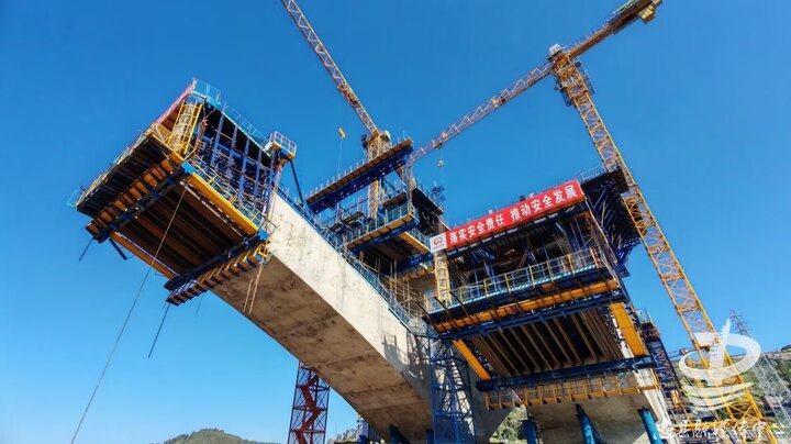 目前,桥梁的1号墩、2号墩墩柱已经全部完成,正在开展桥梁上部结构施工——采取挂篮施工法对桥梁上下弦段进行悬臂现浇,累计完成总工程量的45%。