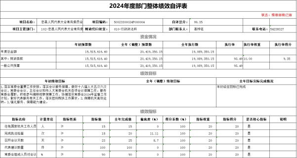 根据预算绩效管理要求,本部门无重点专项项目,只对本部门整体绩效目标开展自评。其中,县人大本级和信息中心共同以填报自评表形式开展自评,涉及资金1908.94万元。