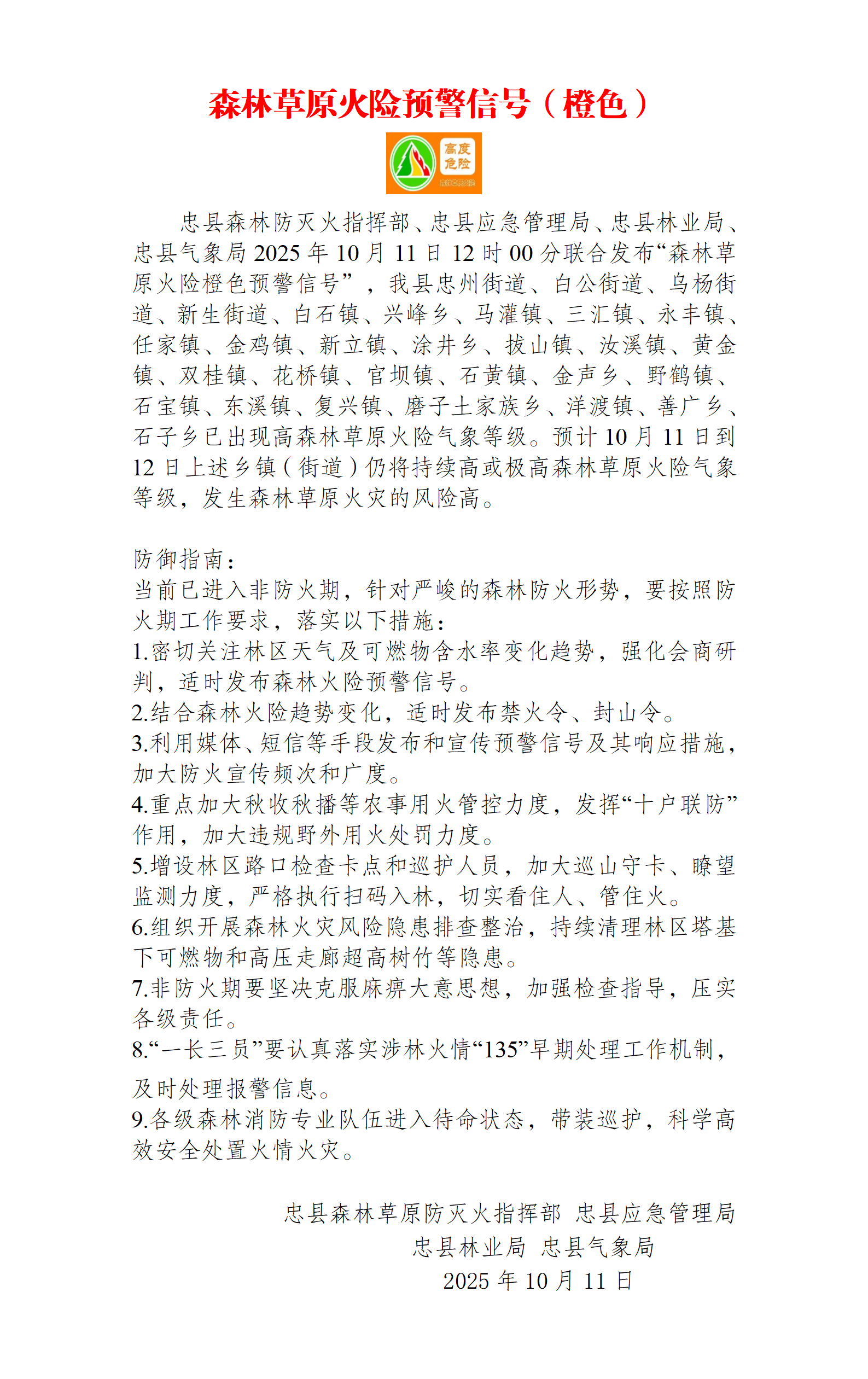 森林草原火险橙色预警信号