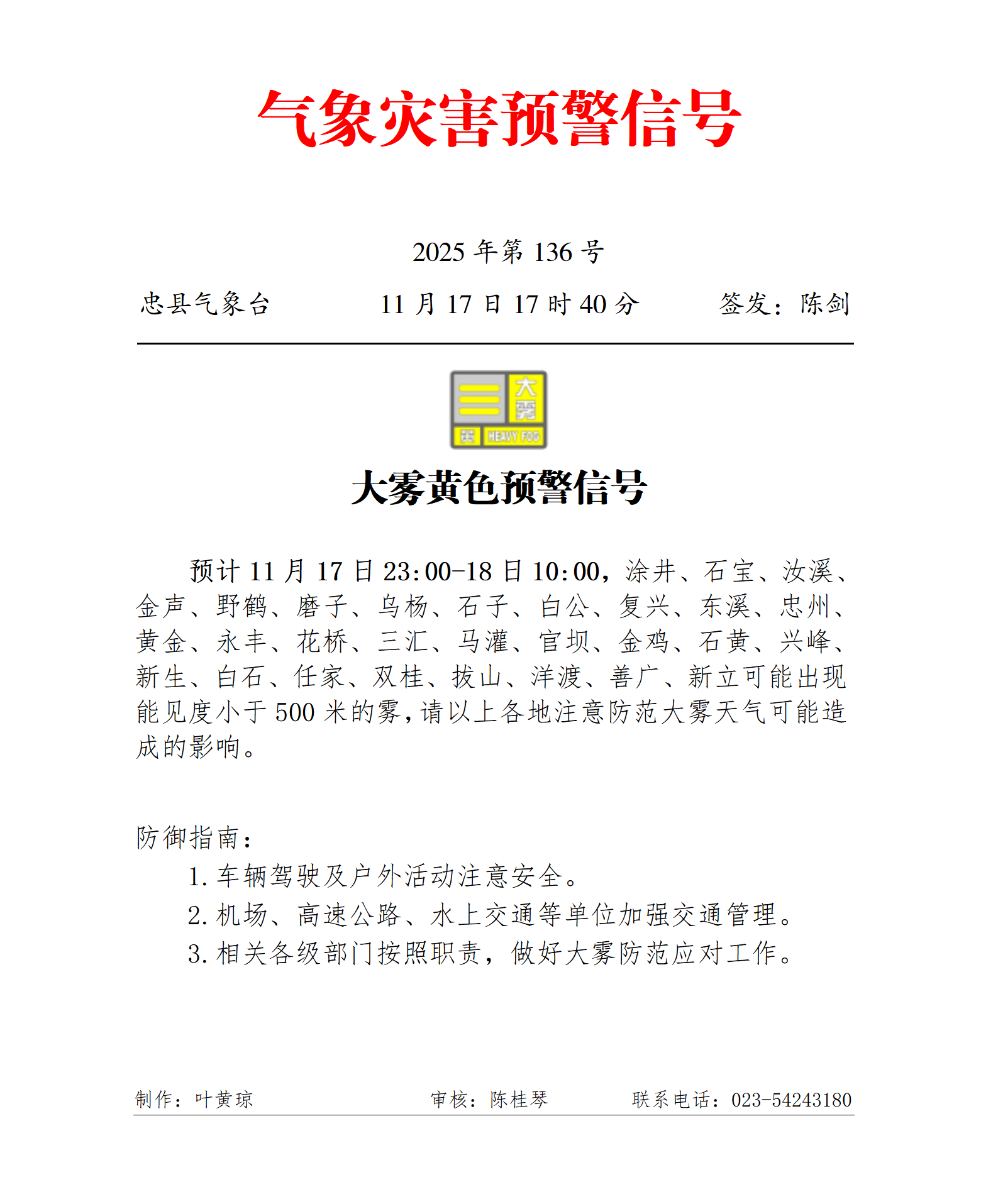 忠县预警信号发布2025年第136期大雾黄色预警信号