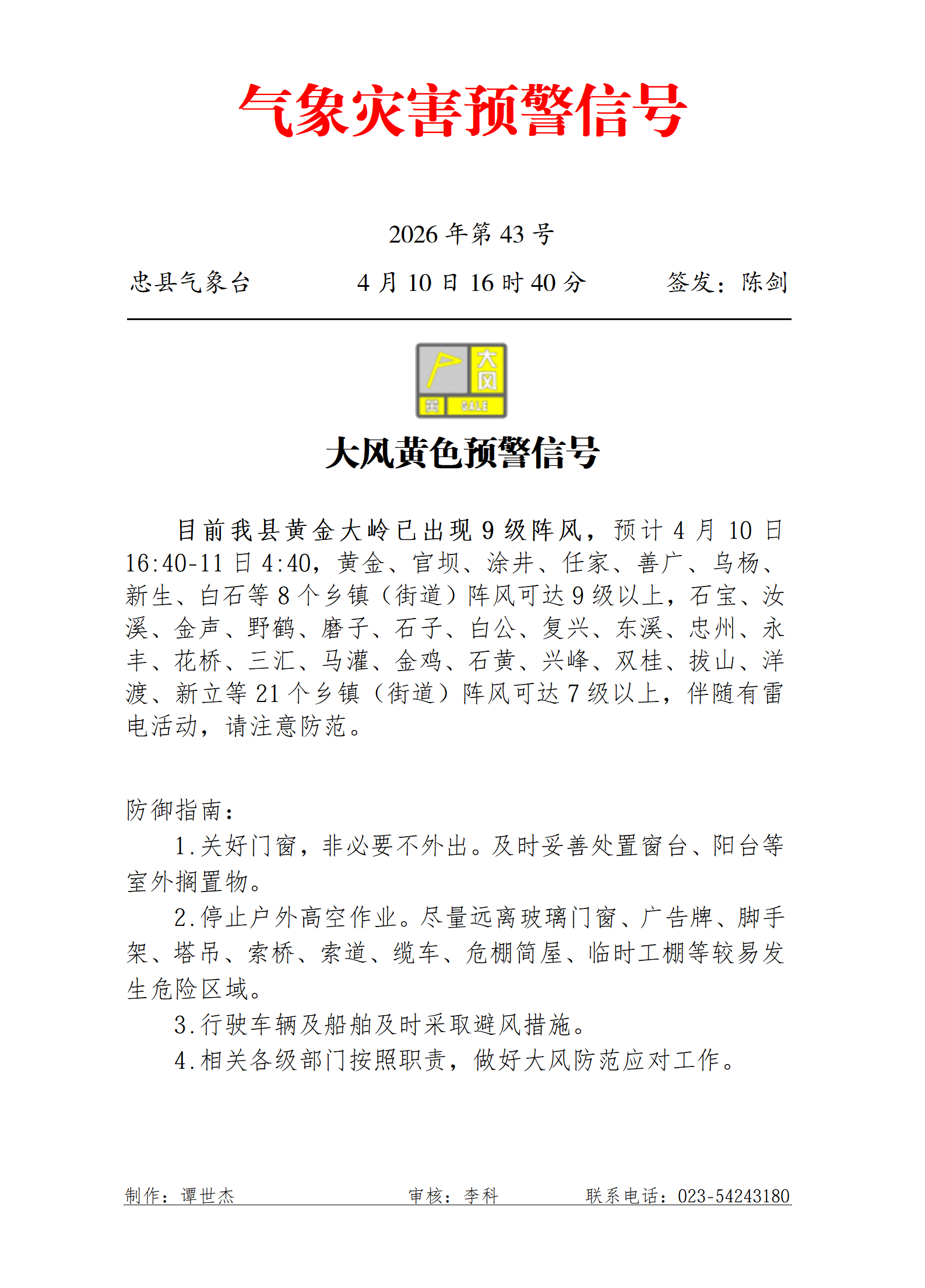 忠县预警信号发布2026年第43期大风黄色预警信号