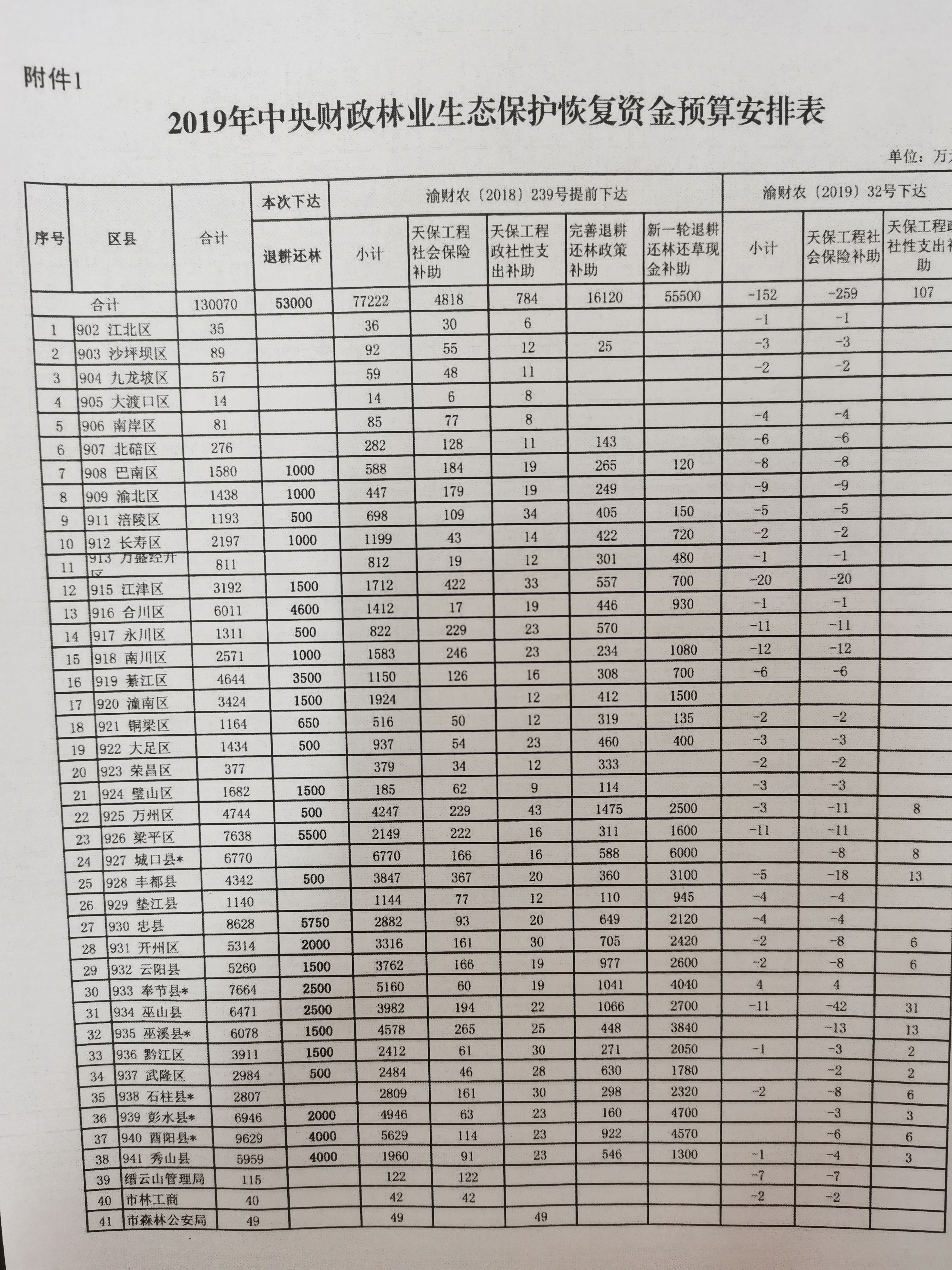 附件: 1.重庆市2019年中央林业生态保护恢复资金预算安排表