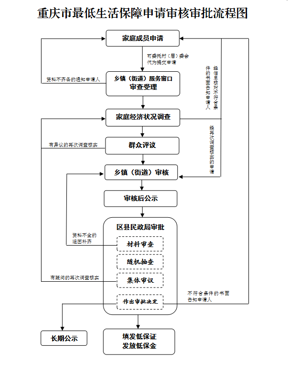 申请→受理→核查→调查→评议→审核→审批→公示→发放低保证和低保金。
