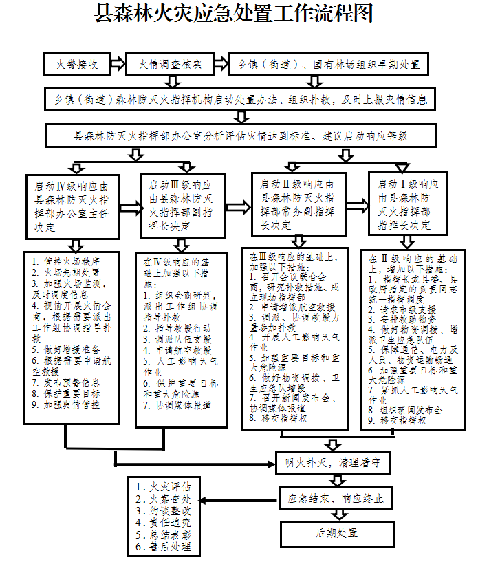 森林火灾应对工作坚持“统一领导、协调联动,分级负责、属地为主,以人为本、科学扑救,快速反应、安全高效”的原则,实行各级政府行政首长负责制。森林火灾发生后,县政府、有关部门立即按照职责分工和相关预案开展处置工作。县政府是应对本区域森林火灾的主体,并根据森林火灾应对工作需要,及时启动应急响应、组织应急救援。
