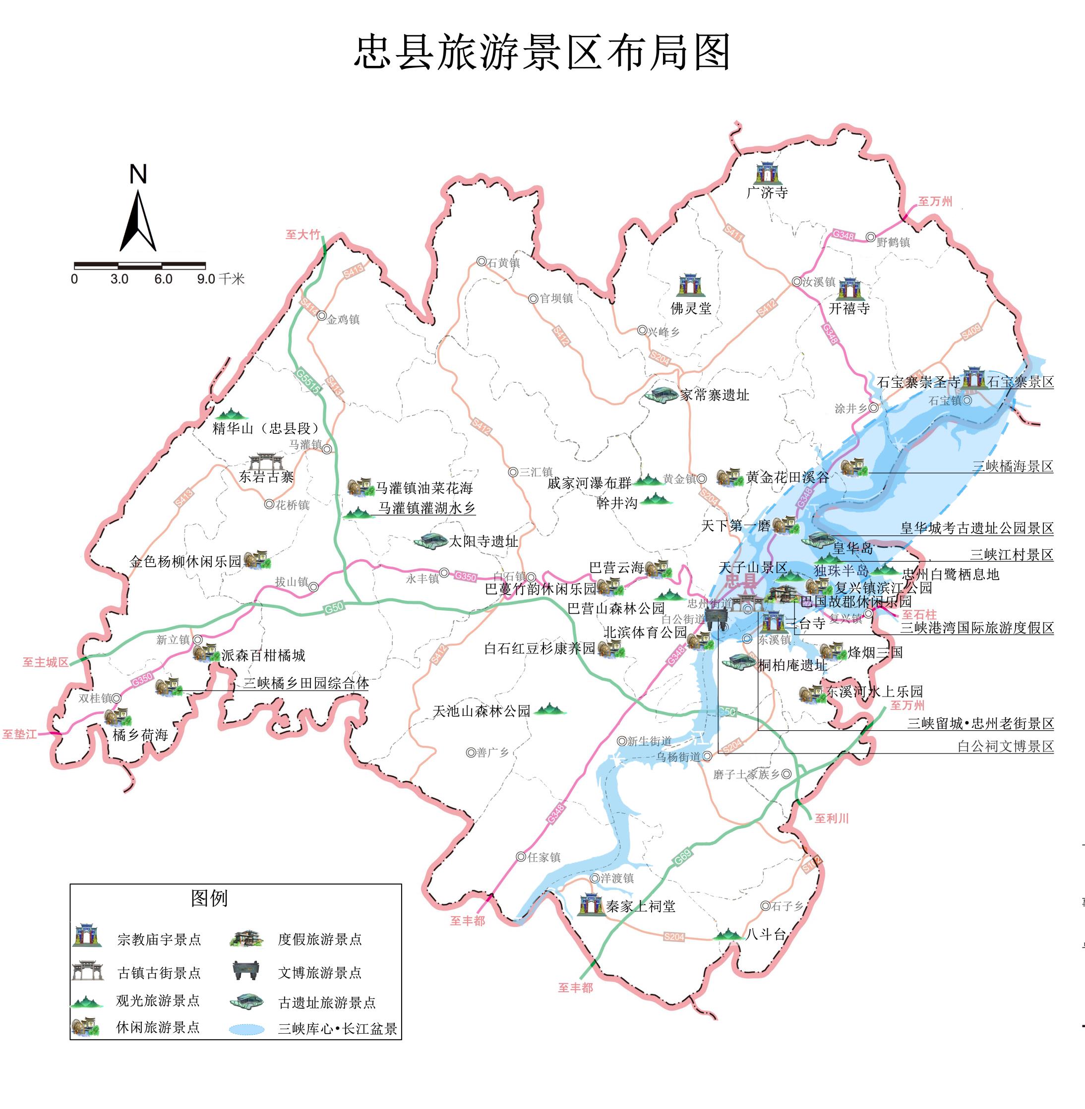 7.“三峡库心·长江盆景”。2020年7月,中共中央政治局委员、重庆市委书记陈敏尔调研忠县时指出:立足自身优势、突出本地特色,坚定不移护生态、因地制宜谋发展,统筹江城与江村、山水与人文等要素,推动产城景、农文旅深度融合,加强与周边区县协作互动,高水平打造“三峡库心·长江盆景”。“三峡库心·长江盆景”以忠县、石柱县沿江区域及万州区武陵镇共11个镇乡、5个街道为主体的区域,涉及长江岸线140公里,共约978平方公里。