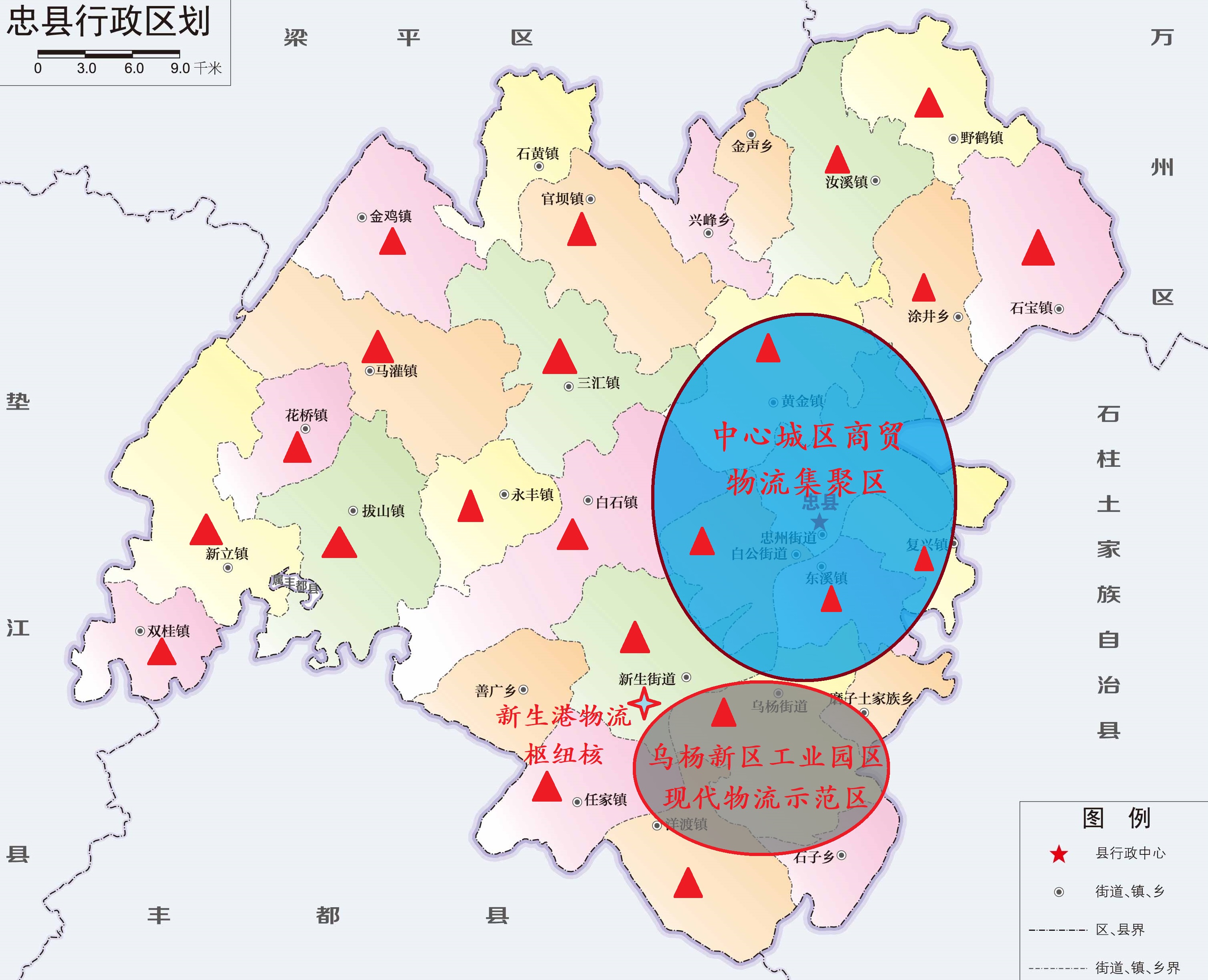 中心城区商贸物流集聚区。一是以高质量服务中心城区居民生活为目标,依托忠州购物公园、“爱琴海”购物公园、金天门购物广场等,以日用百货、农副产品、家居建材、纺织服装等为重点,发展壮大分拨配送、电商物流、冷链物流、医药物流等传统物流模式,打造区域性商贸物流中心。二是以促进电商快递产业集聚发展为目标,依托五洲国际电商产业园,整合邮政、四通一达等快递物流资源,推进电商与快递物流融合发展,重点发展快递区域分拨中心和电商集配云仓等业务;建设五洲国际仓储物流产业园,打造城乡物流共同配送中心,发展第三方专业化共同配送,完善城乡共同配送网络体系。三是以推动农产品提档升级为目标,依托农批智慧城和渝东北农副产品及进口肉类冷链加工集配中心等项目,发展农副产品展销、检验检疫、冷链仓储、大数据运营、物流配送等功能,带动优质农副产品在忠县集散分拨,打造区域性农副产品物流集散中心。