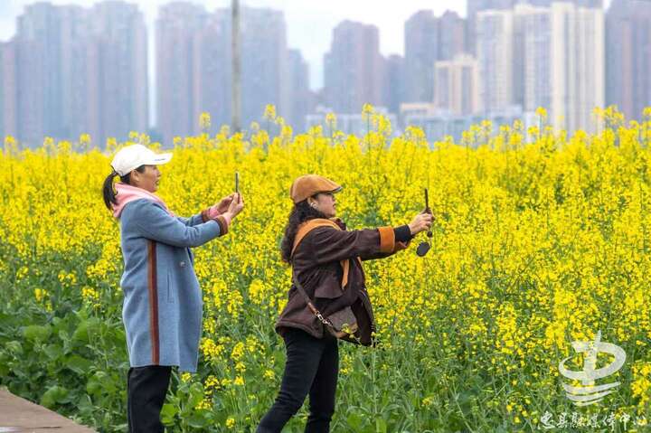 春回大地,天气渐暖。近日,长江忠县段南岸复兴镇水坪社区的油菜花竞相绽放,吸引游客前来打卡拍照,感受春光。